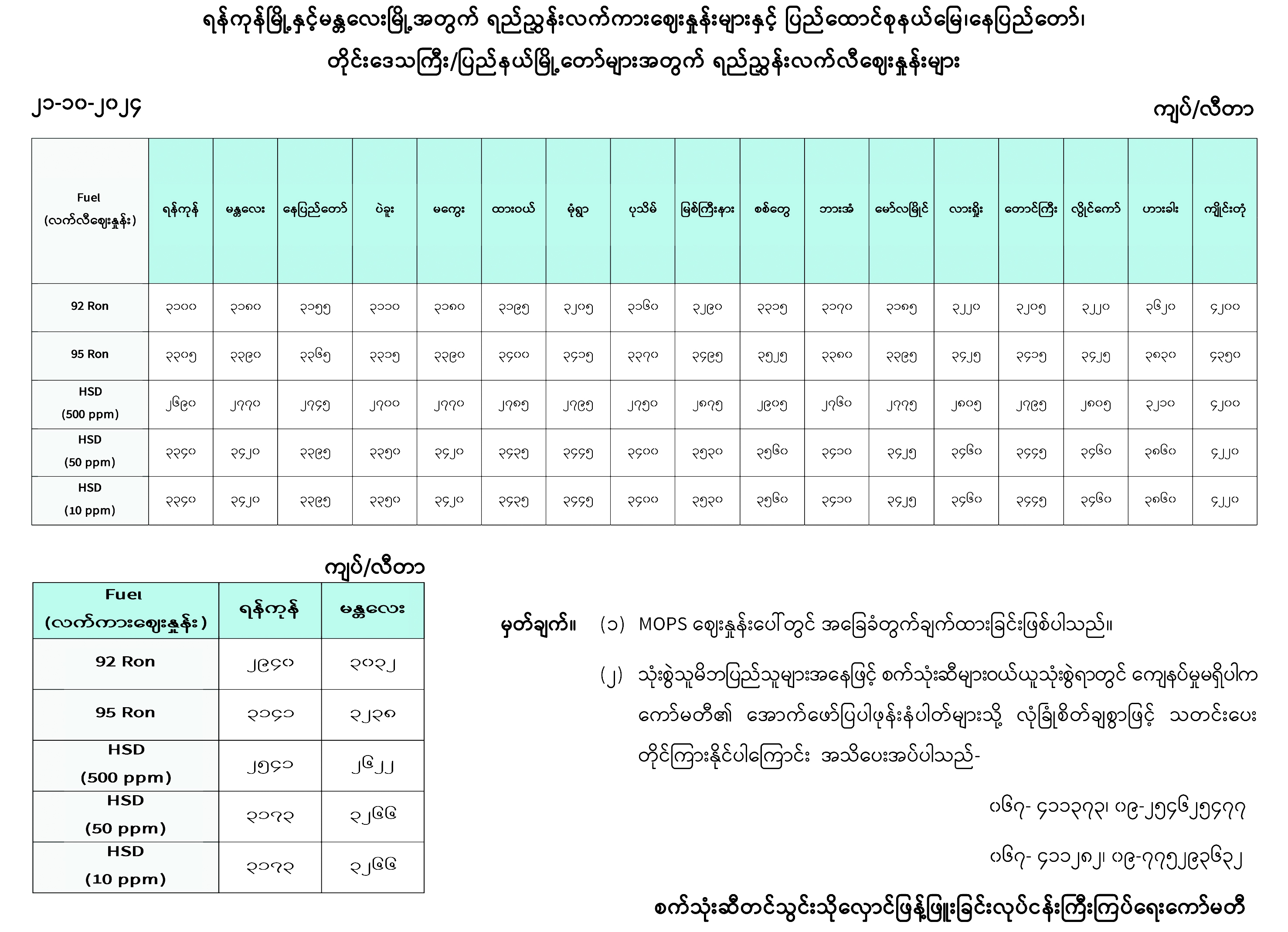 ရန်ကုန်မြို့နှင့် မန္တလေးမြို့အတွက် ရည်ညွှန်းလက်ကားဈေးနှုန်းများနှင့် ပြည်ထောင်စုနယ်မြေ နေပြည်တော်၊ တိုင်းဒေသကြီး/ ပြည်နယ် မြို့တော်များအတွက် ရည်ညွှန်းလက်လီဈေးနှုန်းများ