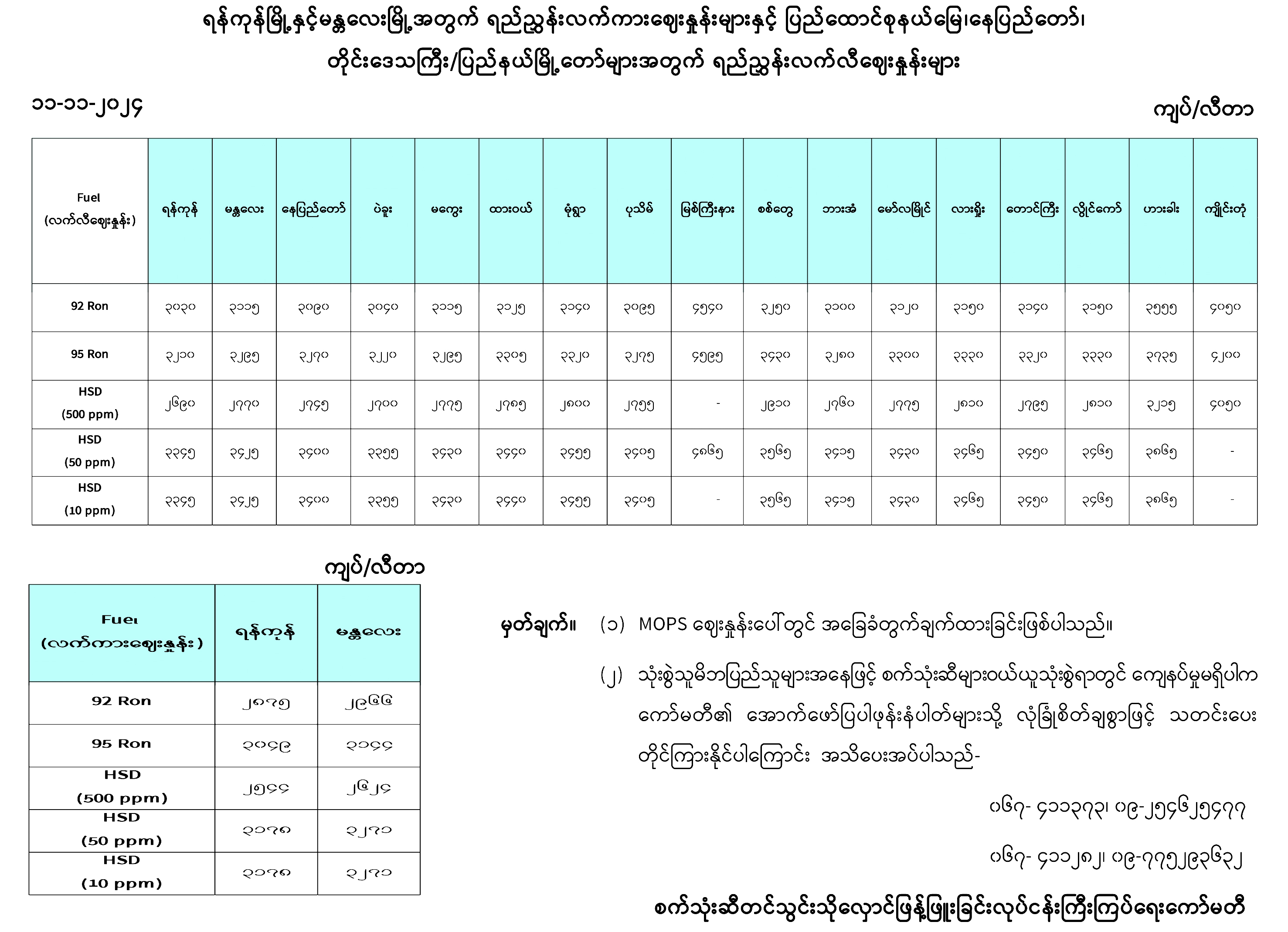 ရန်ကုန်မြို့နှင့် မန္တလေးမြို့အတွက် ရည်ညွှန်းလက်ကားဈေးနှုန်းများနှင့် ပြည်ထောင်စုနယ်မြေ နေပြည်တော်၊ တိုင်းဒေသကြီး/ ပြည်နယ် မြို့တော်များအတွက် ရည်ညွှန်းလက်လီဈေးနှုန်းများ
