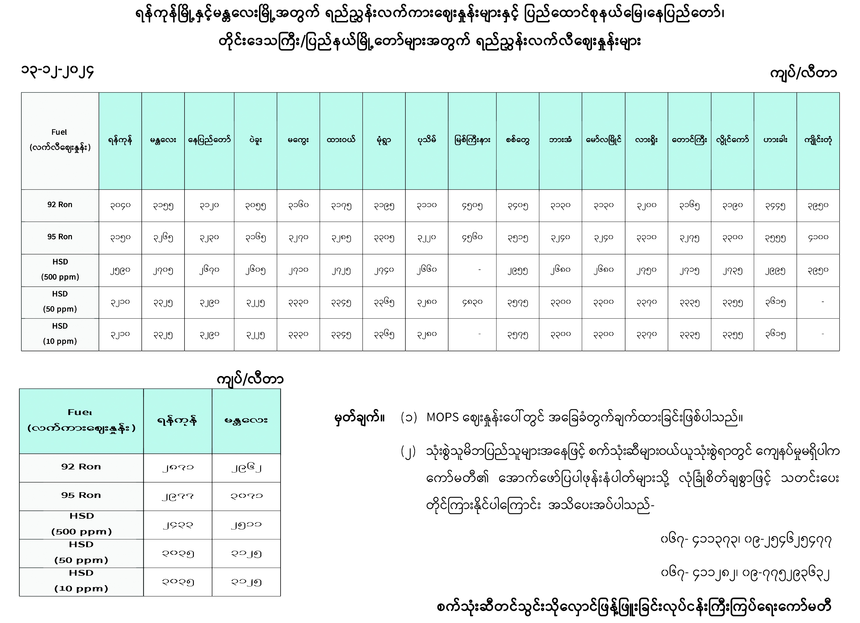 ရန်ကုန်မြို့နှင့် မန္တလေးမြို့အတွက် ရည်ညွှန်းလက်ကားဈေးနှုန်းများနှင့် ပြည်ထောင်စုနယ်မြေ နေပြည်တော်၊ တိုင်းဒေသကြီး/ ပြည်နယ် မြို့တော်များအတွက် ရည်ညွှန်းလက်လီဈေးနှုန်းများ