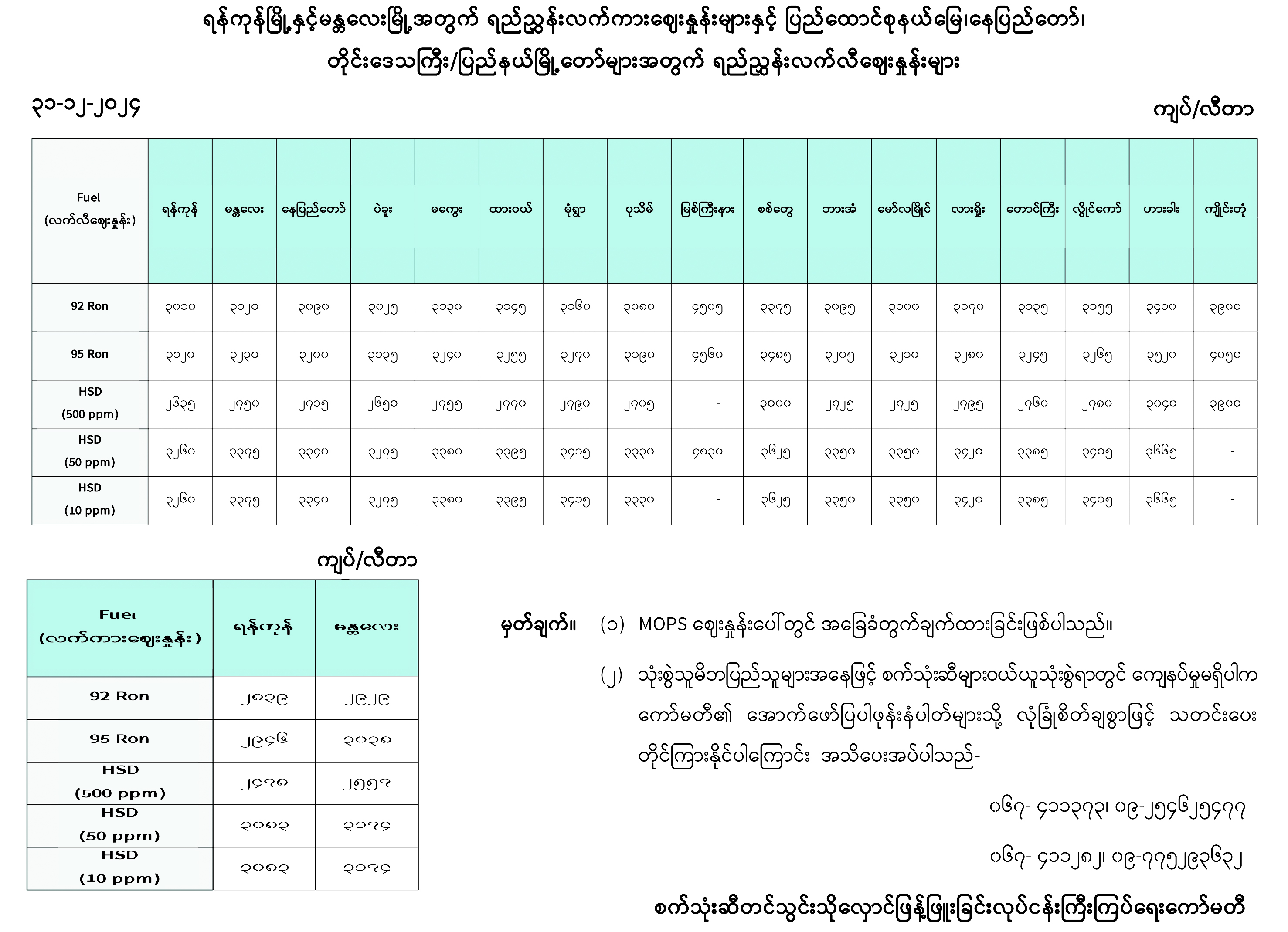 ရန်ကုန်မြို့နှင့် မန္တလေးမြို့အတွက် ရည်ညွှန်းလက်ကားဈေးနှုန်းများနှင့် ပြည်ထောင်စုနယ်မြေ နေပြည်တော်၊ တိုင်းဒေသကြီး/ ပြည်နယ် မြို့တော်များအတွက် ရည်ညွှန်းလက်လီဈေးနှုန်းများ