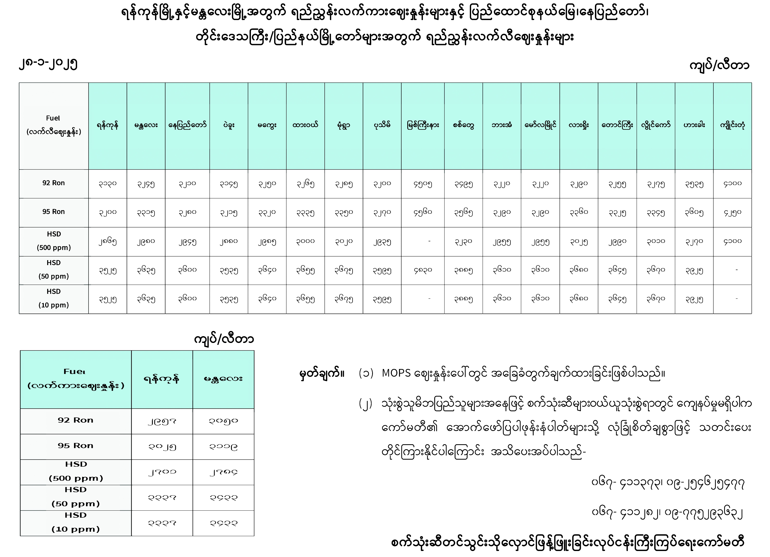 ရန်ကုန်မြို့နှင့် မန္တလေးမြို့အတွက် ရည်ညွှန်းလက်ကားဈေးနှုန်းများနှင့် ပြည်ထောင်စုနယ်မြေ နေပြည်တော်၊ တိုင်းဒေသကြီး/ ပြည်နယ် မြို့တော်များအတွက် ရည်ညွှန်းလက်လီဈေးနှုန်းများ