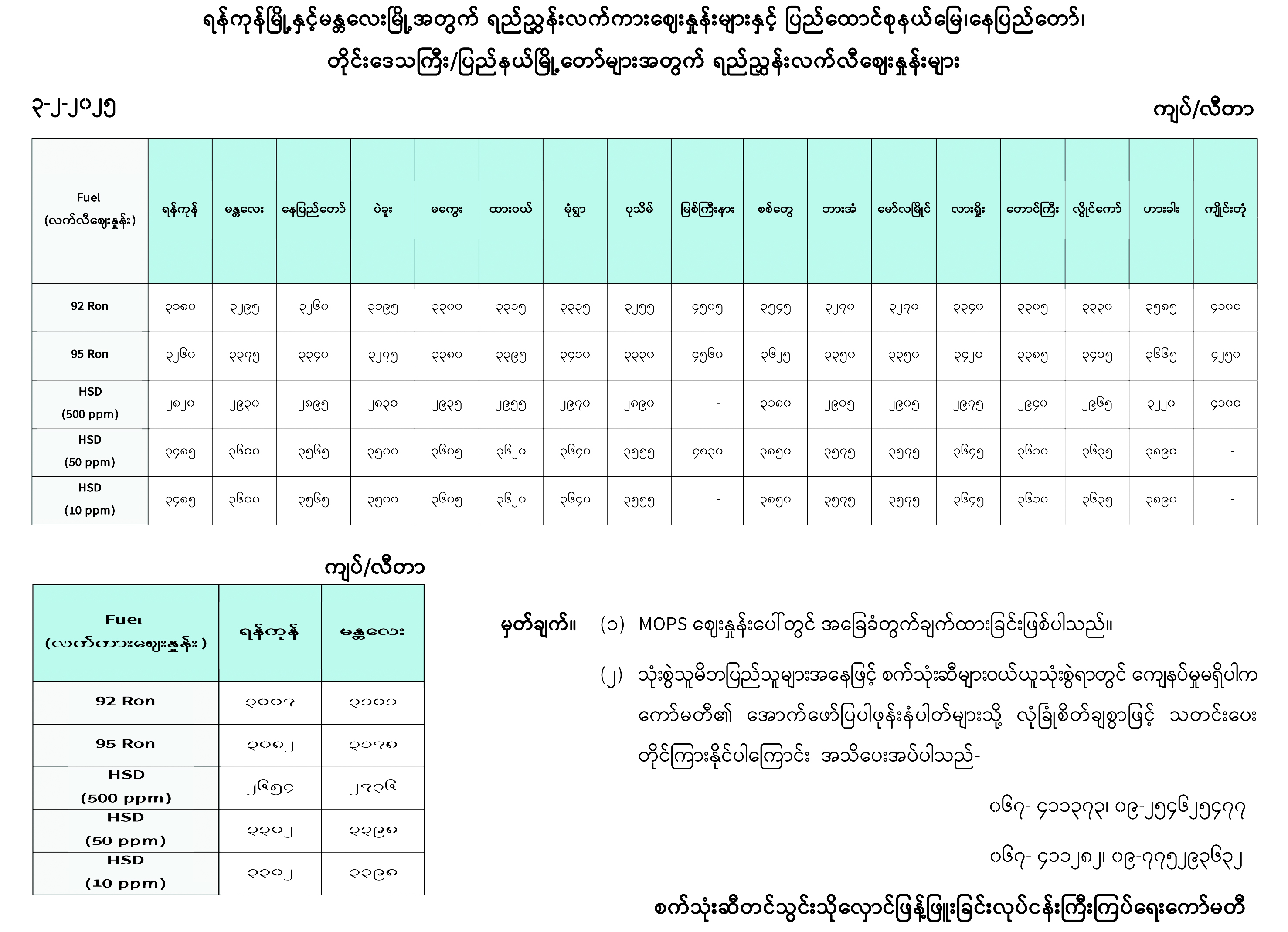 ရန်ကုန်မြို့နှင့် မန္တလေးမြို့အတွက် ရည်ညွှန်းလက်ကားဈေးနှုန်းများနှင့် ပြည်ထောင်စုနယ်မြေ နေပြည်တော်၊ တိုင်းဒေသကြီး/ ပြည်နယ် မြို့တော်များအတွက် ရည်ညွှန်းလက်လီဈေးနှုန်းများ