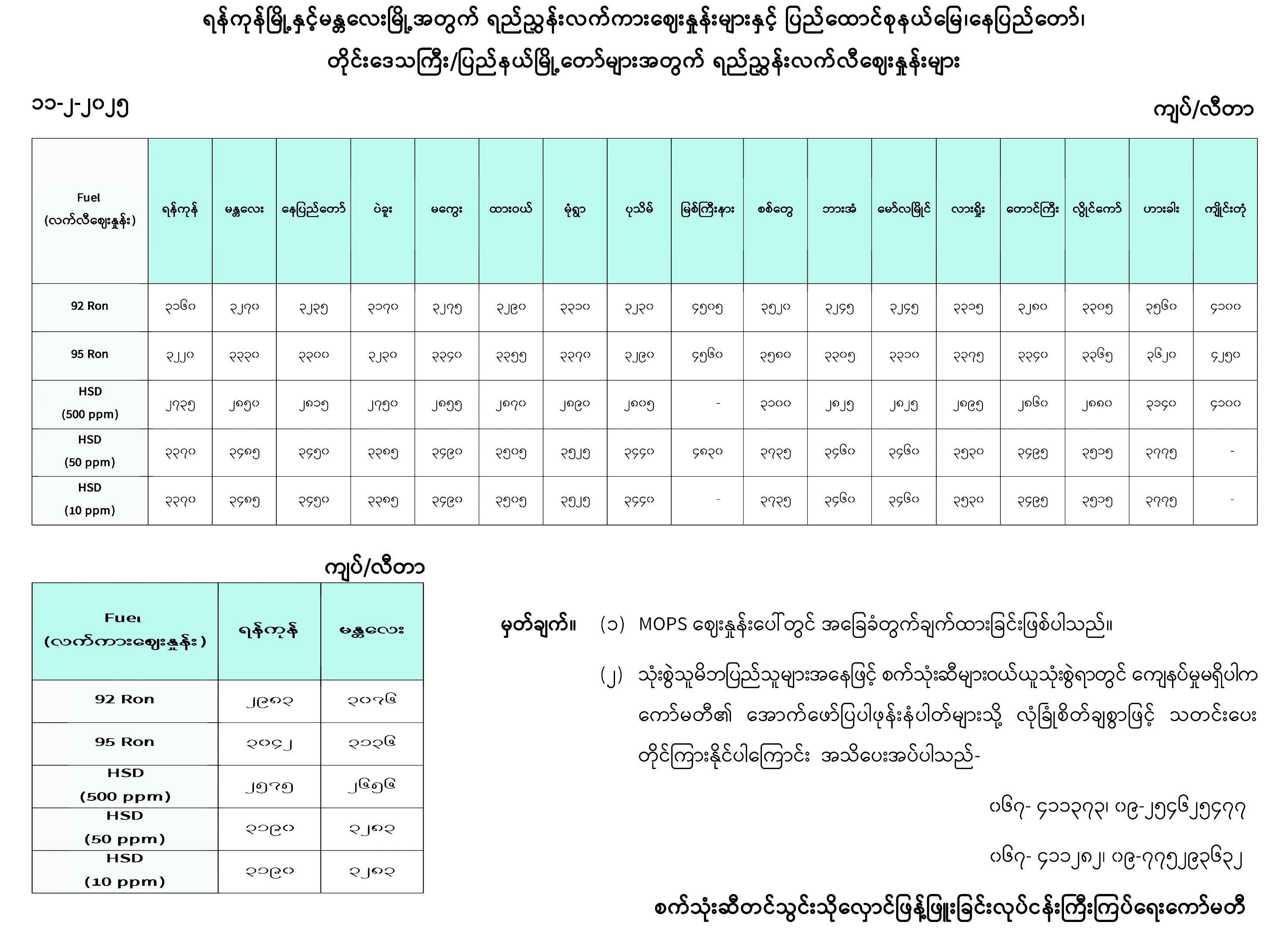 ရန်ကုန်မြို့နှင့် မန္တလေးမြို့အတွက် ရည်ညွှန်းလက်ကားဈေးနှုန်းများနှင့် ပြည်ထောင်စုနယ်မြေ နေပြည်တော်၊ တိုင်းဒေသကြီး/ ပြည်နယ် မြို့တော်များအတွက် ရည်ညွှန်းလက်လီဈေးနှုန်းများ