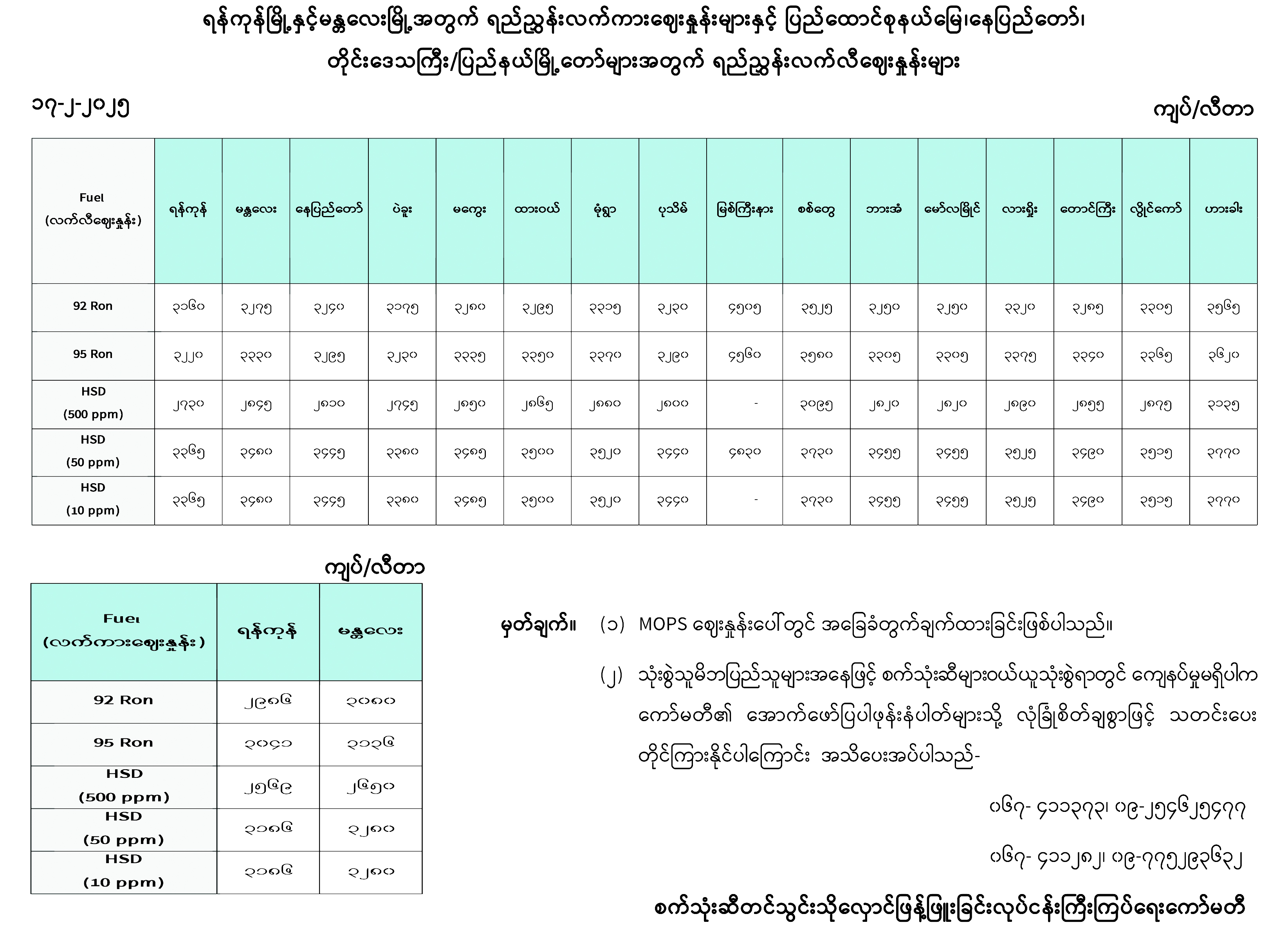 ရန်ကုန်မြို့နှင့် မန္တလေးမြို့အတွက် ရည်ညွှန်းလက်ကားဈေးနှုန်းများနှင့် ပြည်ထောင်စုနယ်မြေ နေပြည်တော်၊ တိုင်းဒေသကြီး/ ပြည်နယ် မြို့တော်များအတွက် ရည်ညွှန်းလက်လီဈေးနှုန်းများ