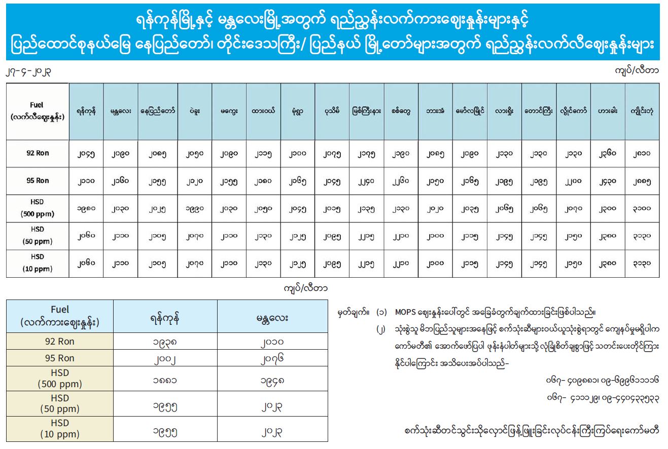 ရန်ကုန်မြို့နှင့် မန္တလေးမြို့အတွက် ရည်ညွှန်းလက်ကားဈေးနှုန်းများနှင့် ပြည်ထောင်စုနယ်မြေ နေပြည်တော်၊ တိုင်းဒေသကြီး/ ပြည်နယ် မြို့တော်များအတွက် ရည်ညွှန်းလက်လီဈေးနှုန်းများ