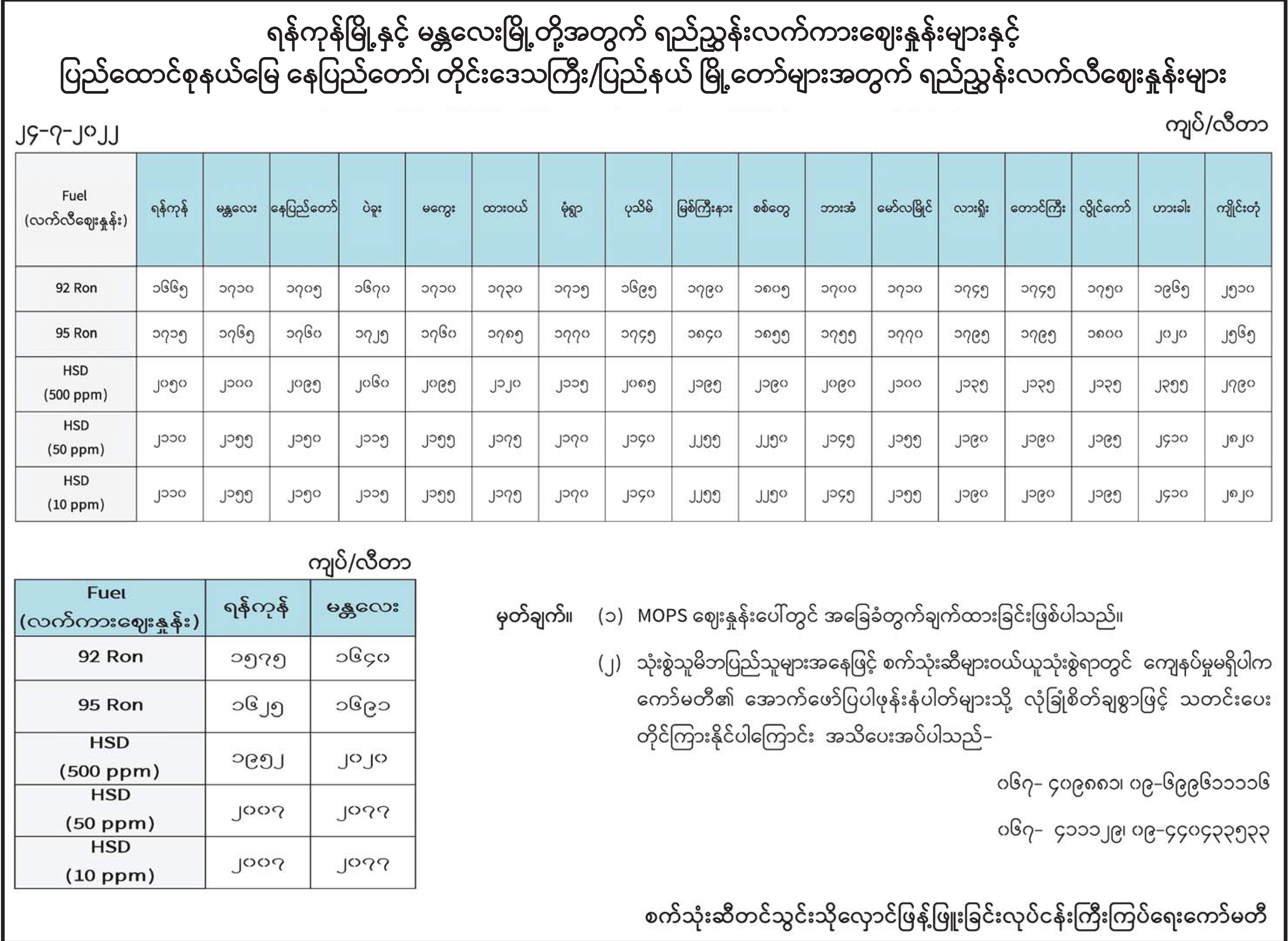ရန်ကုန်မြို့နှင့် မန္တလေးမြို့တို့အတွက် ရည်ညွှန်းလက်ကားဈေးနှုန်းများနှင့် ပြည်ထောင်စုနယ်မြေ နေပြည်တော်၊ တိုင်းဒေသကြီး/ပြည်နယ် မြို့တော်များအတွက် ရည်ညွှန်းလက်လီဈေးနှုန်းများ