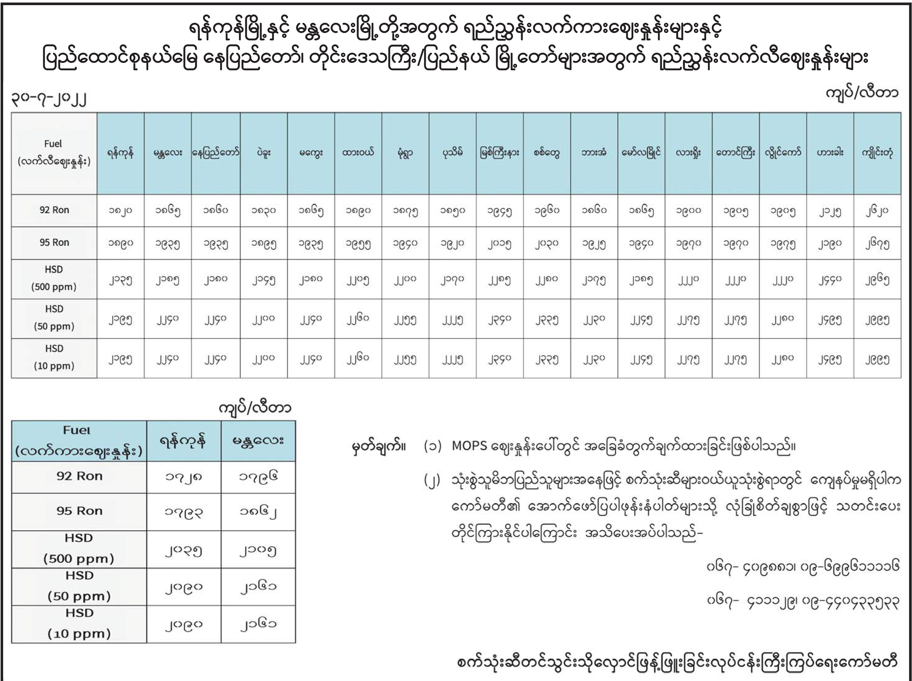 ရန်ကုန်မြို့နှင့် မန္တလေးမြို့တို့အတွက် ရည်ညွှန်းလက်ကားဈေးနှုန်းများနှင့် ပြည်ထောင်စုနယ်မြေ နေပြည်တော်၊ တိုင်းဒေသကြီး/ပြည်နယ်မြို့တော်များအတွက် ရည်ညွှန်းလက်လီဈေးနှုန်းများ