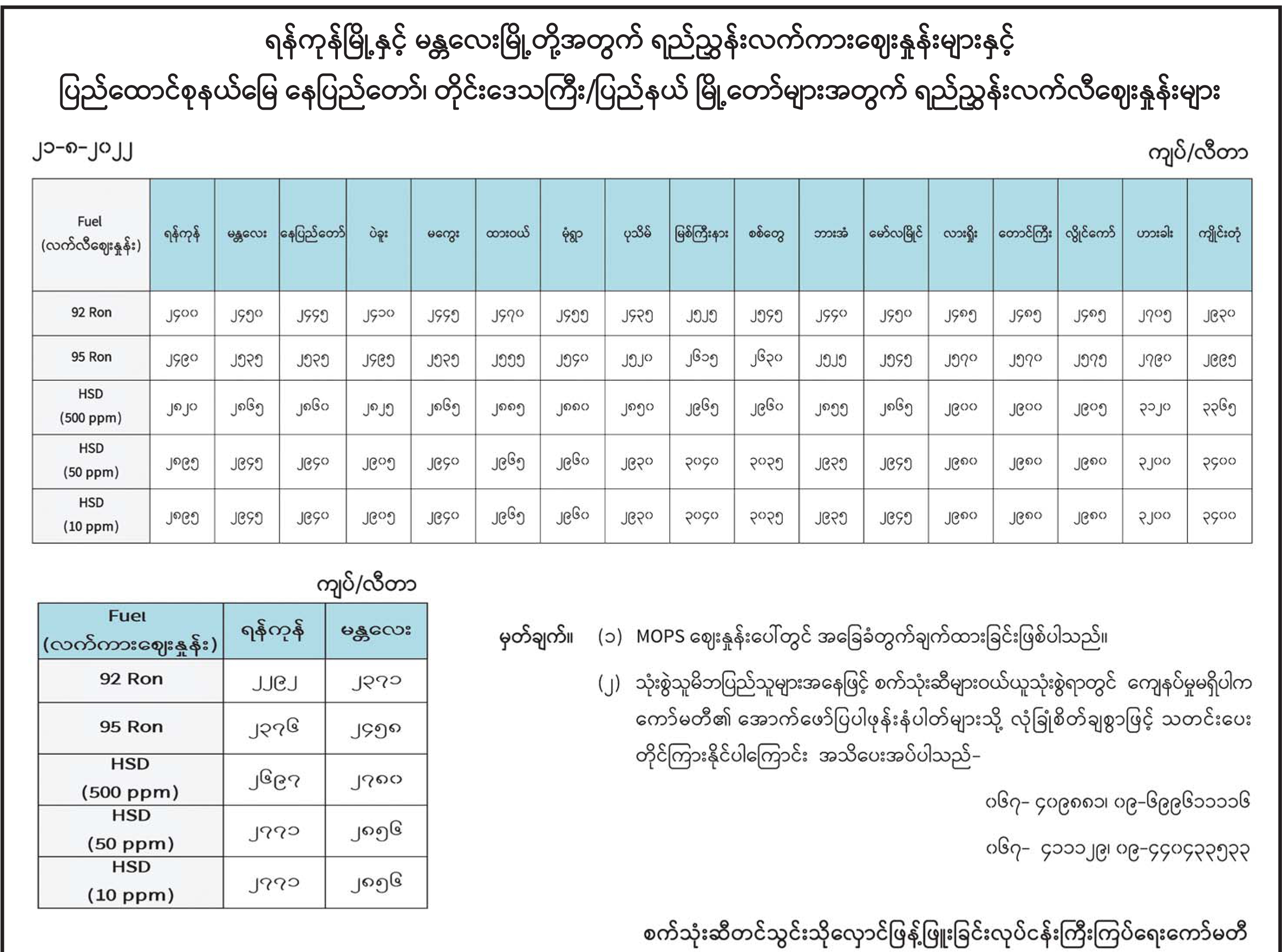 ရန်ကုန်မြို့နှင့် မန္တလေးမြို့တို့အတွက် ရည်ညွှန်းလက်ကားဈေးနှုန်းများနှင့် ပြည်ထောင်စုနယ်မြေ နေပြည်တော်၊ တိုင်းဒေသကြီး/ပြည်နယ် မြို့တော်များအတွက် ရည်ညွှန်းလက်လီဈေးနှုန်းများ