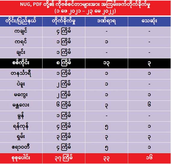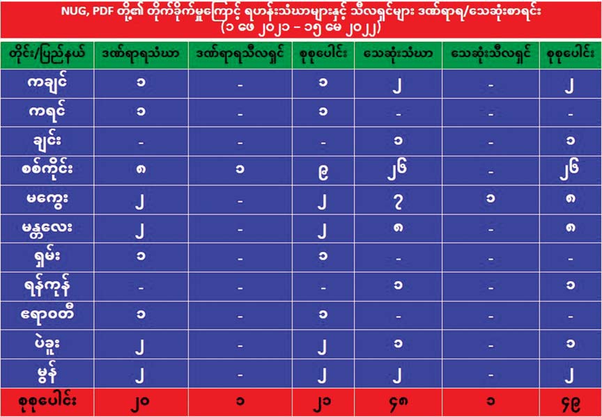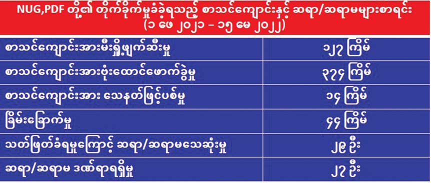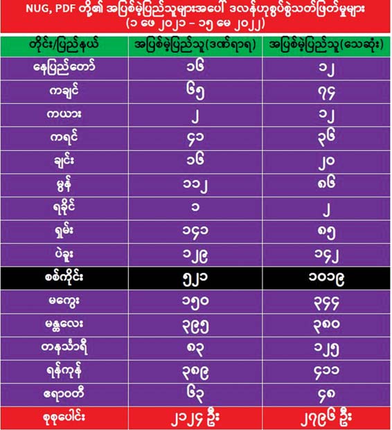 NUG နဲ့ PDF တွေကို ပြည်သူတစ်ရပ်လုံးက အမှန်တကယ် ထောက်ခံပါတယ်ဆိုရင် ဒီလိုအကြမ်းဖက်မှုတွေ၊ သေဆုံးမှုတွေ ရှိလာစရာအကြောင်းမရှိဘူးဆိုတာ အင်မတန်သိသာထင်ရှားပါတယ်။ သူတို့ကို မထောက်ခံတဲ့သူ၊ သူတို့နဲ့ အမြင်မတူတဲ့သူတွေ ရှိနေလို့သာ ငါနဲ့ မတူ ငါ့ရန်သူဆိုတဲ့စိတ်နဲ့ ကိုယ့်ကိုမထောက်ခံတဲ့သူတွေရဲ့ အသံမထွက်ရဲအောင် ဥပဒေမဲ့အကြမ်းဖက်တိုက်ခိုက်၊ သတ်ဖြတ်ပြီး တစ်နိုင်ငံလုံးကို ဖျက်ဆီးဖို့ လုပ်နေကြတာဖြစ်ပါတယ်။
