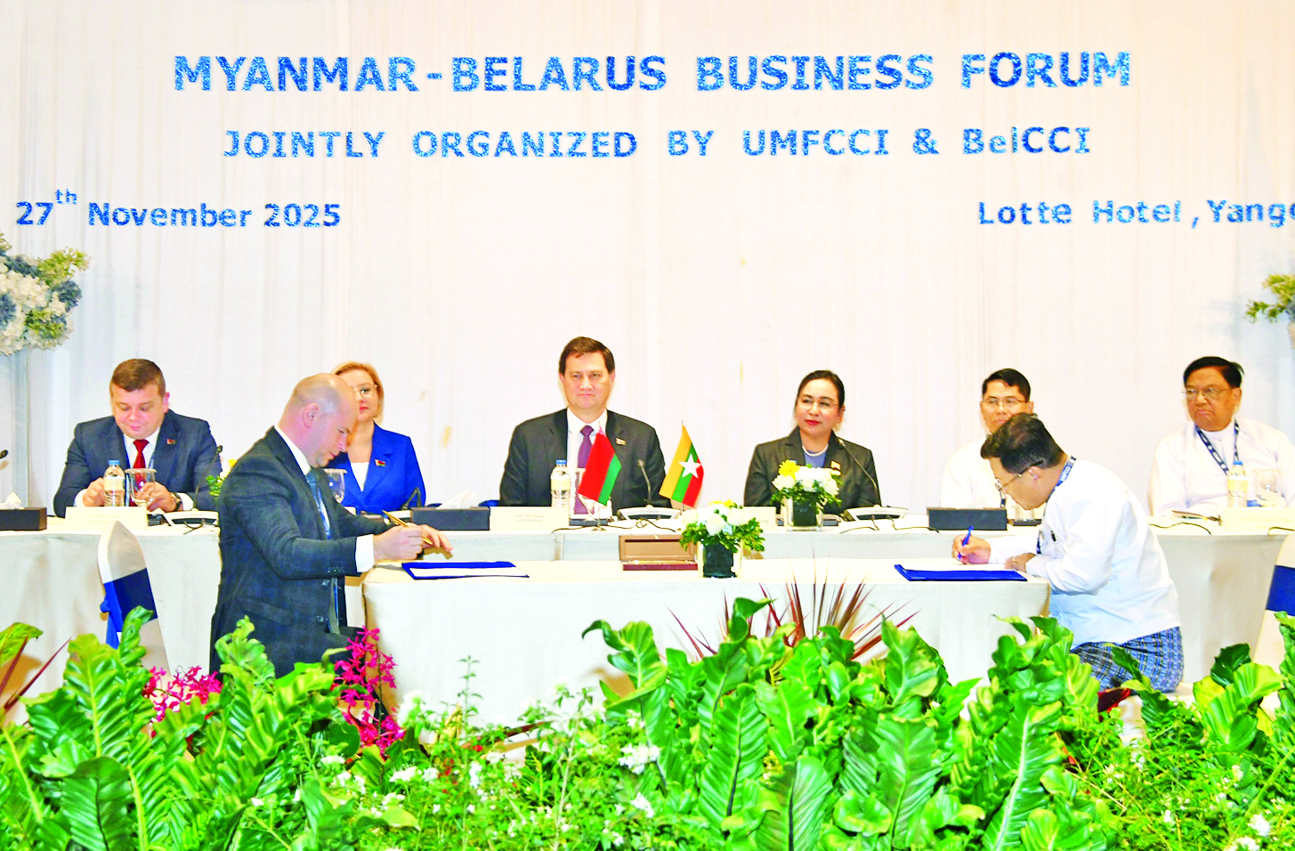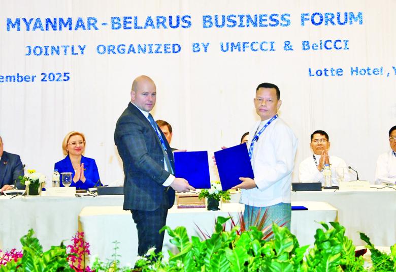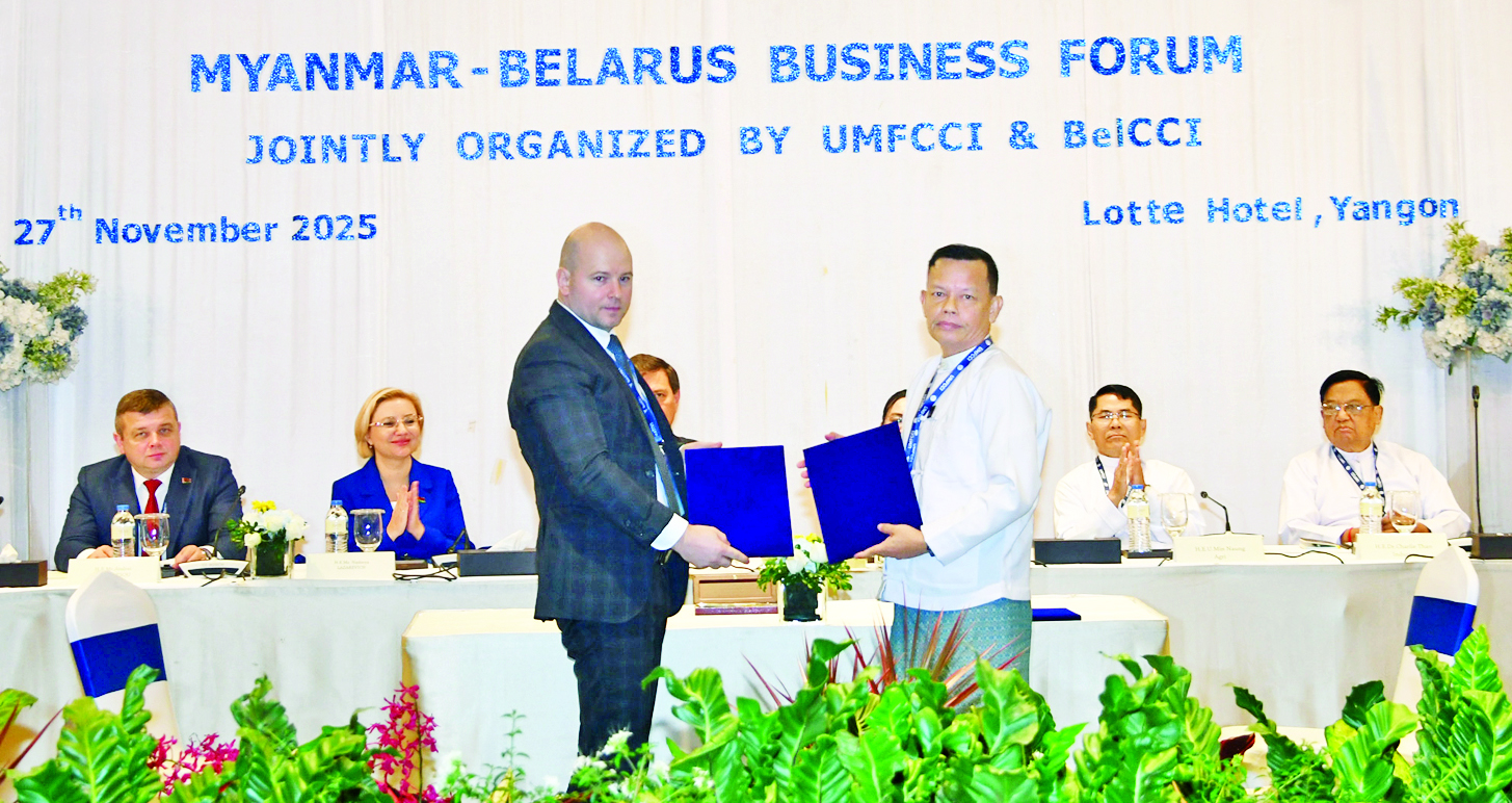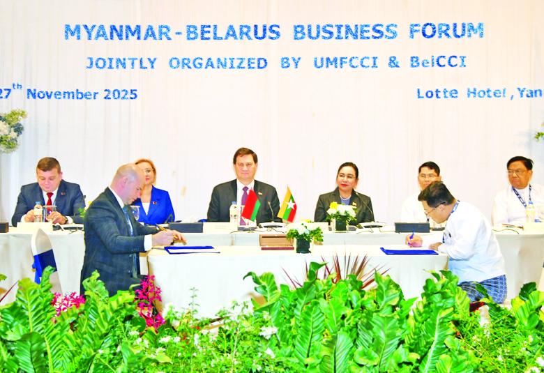 မြန်မာနှင့် ဘယ်လာရုစ်နှစ်နိုင်ငံအကြား စီးပွားရေးနှင့် ရင်းနှီးမြှုပ်နှံမှုလုပ်ငန်းများ တိုးမြှင့်ဆောင်ရွက်နိုင်ရေးအတွက် နှစ်နိုင်ငံကုန်သည်စက်မှုအသင်းများဖြစ်ကြသော UMFCCI နှင့် BelCCI တို့ပူးပေါင်း၍ မြန်မာ-ဘယ်လာရုစ် စီးပွားရေးဖိုရမ်ကို ယနေ့နံနက်ပိုင်းတွင် ရန်ကုန်မြို့ LOTTEE ဟိုတယ်၌ ကျင်းပသည်။