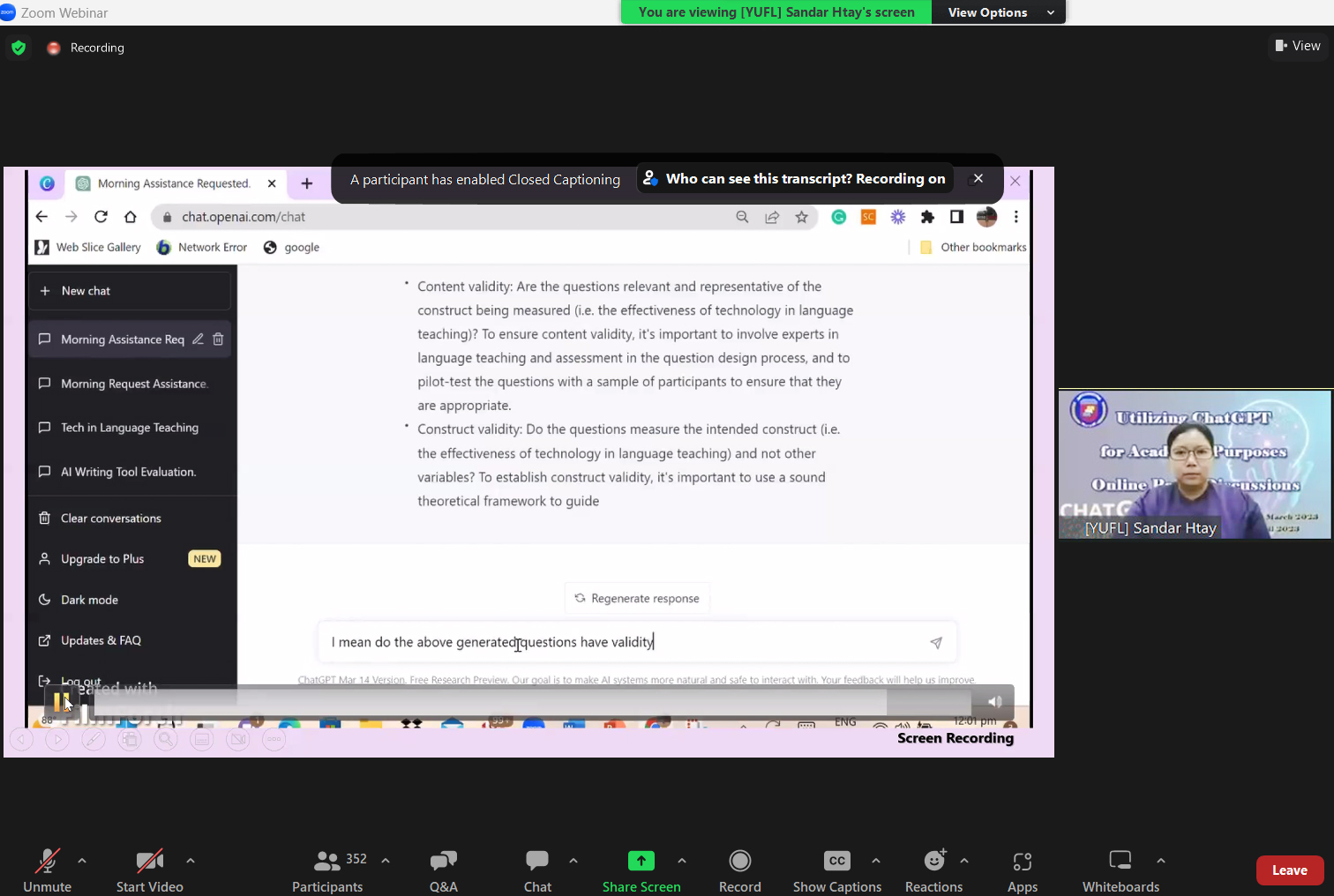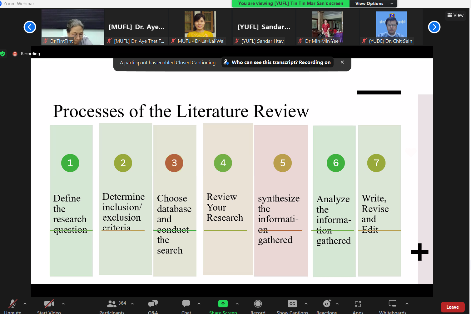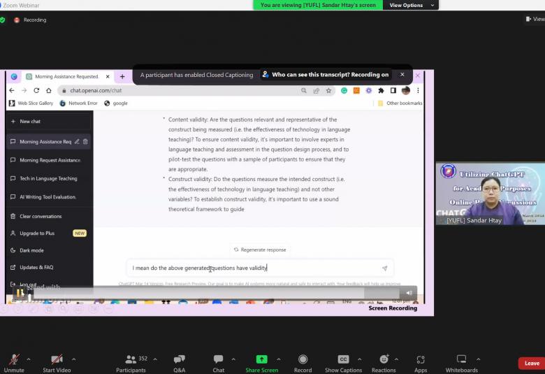 ယခု Online Webinar မှာ (၄)ရက်တာ ဆွေးနွေးပွဲဖြစ်ပြီး ပထမနေ့ အစီအစဉ်အဖြစ် Utilizing ChatGPT For Research ဆွေးနွေးပွဲကို ပါမောက္ခချုပ် ဒေါက်တာကြည်ရွှင်၊ ဒုတိယပါမောက္ခချုပ် ဒေါက်တာမြင့်မြင့်မော်နှင့် ဆရာမ(၅)ဦးတို့က ဆွေးနွေးခဲ့ကြသည်။