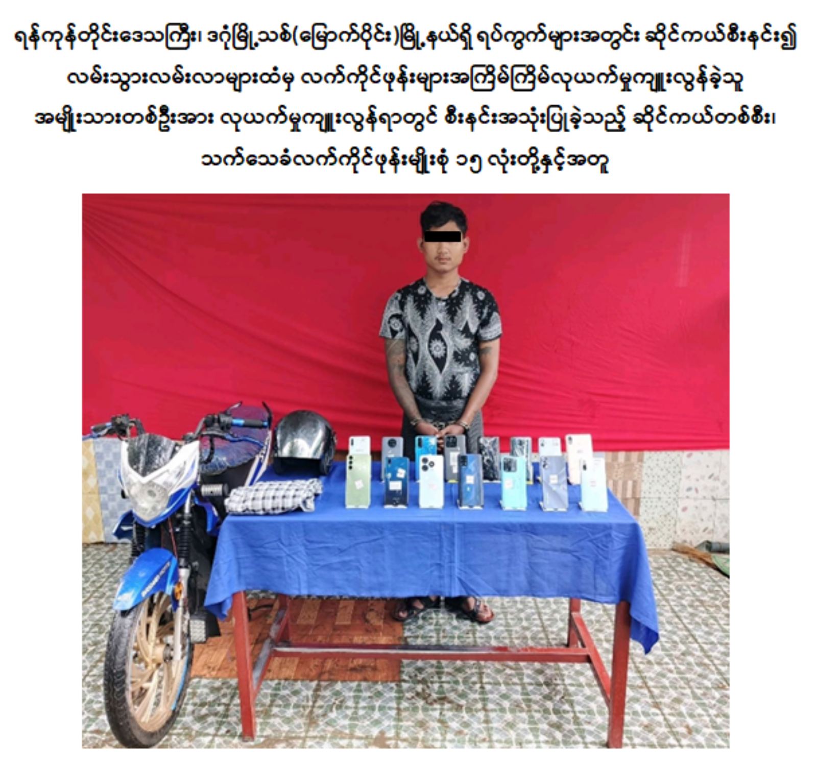 ရန်ကုန်တိုင်းဒေသကြီး၊ ဒဂုံမြို့သစ် (မြောက်ပိုင်း) မြို့နယ်၌ မော်တော်ဆိုင်ကယ်စီးနင်း၍ လမ်းသွားလမ်းလာများထံမှ လက်ကိုင်ဖုန်းများ အကြိမ်ကြိမ်လုယက်မှုကျူးလွန်ခဲ့သူ တရားခံ အမျိုးသားတစ်ဦးအား ဖုန်းမျိုးစုံ ၁၅ လုံးနှင့်အတူ ဖမ်းဆီးရမိ