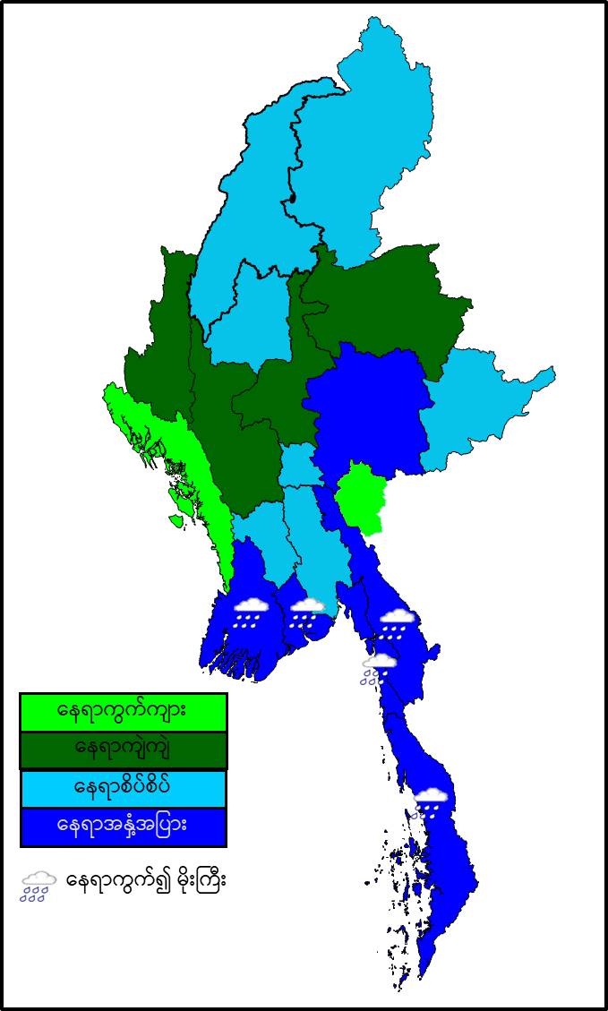 မနက်ဖြန်နံနက်အထိခန့်မှန်းချက်။ ကယားပြည်နယ်နှင့် ရခိုင်ပြည်နယ်တို့တွင် နေရာကွက်ကျား၊ မန္တလေးတိုင်းဒေသကြီး၊ မကွေးတိုင်းဒေသကြီး၊ ချင်းပြည်နယ်နှင့် ရှမ်းပြည်နယ်(မြောက်ပိုင်း)တို့တွင် နေရာကျဲကျဲ၊ နေပြည်တော်၊ ပဲခူးတိုင်းဒေသကြီး၊ စစ်ကိုင်းတိုင်းဒေသကြီး၊ ကချင်ပြည်နယ်နှင့် ရှမ်းပြည်နယ်(အရှေ့ပိုင်း)တို့တွင် နေရာစိပ်စိပ်နှင့် ကျန်တိုင်းဒေသကြီးနှင့် ပြည်နယ်တို့တွင် နေရာအနှံ့အပြား မိုးထစ်ချုန်းရွာပြီး၊ ရန်ကုန်တိုင်းဒေသကြီး၊ ဧရာဝတီတိုင်းဒေသကြီး၊ တနင်္သာရီတိုင်းဒေသကြီး၊ ကရင်ပြည်နယ်နှင့် မွန်ပြည်နယ်တို့တွင် နေရာကွက်၍ မိုးကြီးနိုင်ပါသည်။ ရွာရန်ရာနှုန်းပြည့် ဖြစ်ပါသည်။