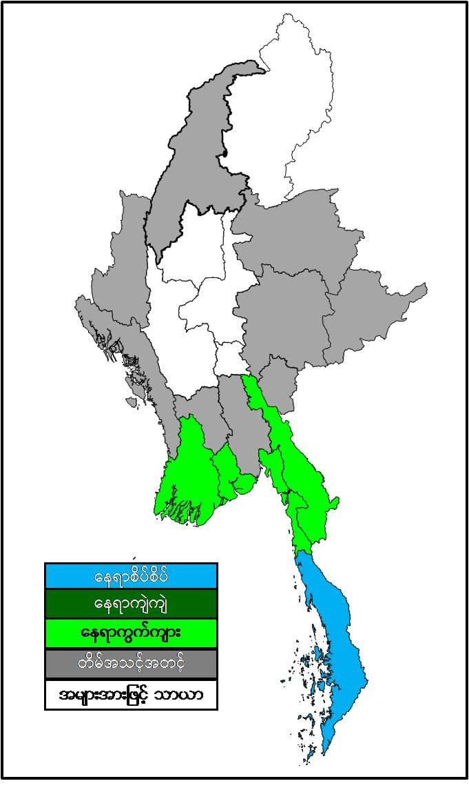 မနက်ဖြန်နံနက်အထိ ခန့်မှန်းချက်မှာ တနင်္သာရီတိုင်းဒေသကြီးတွင် နေရာစိပ်စိပ်နှင့် ရန်ကုန်တိုင်းဒေသကြီး၊ ဧရာဝတီတိုင်းဒေသကြီး၊ ကရင်ပြည်နယ်နှင့် မွန်ပြည်နယ်တို့တွင် နေရာကွက်ကျား မိုးထစ်ချုန်းရွာမည်။ ရွာရန်ရာနှုန်း(၈၀) ဖြစ်သည်။ နေပြည်တော်၊ စစ်ကိုင်းတိုင်းဒေသကြီးအောက်ပိုင်း၊ မန္တလေးတိုင်းဒေသကြီး၊ မကွေးတိုင်းဒေသကြီးနှင့် ကချင်ပြည်နယ် တို့တွင် အများအားဖြင့် သာယာပြီး ကျန်တိုင်းဒေသကြီးနှင့် ပြည်နယ်တို့တွင် တိမ်အသင့်အတင့် ဖြစ်ထွန်းမည်။