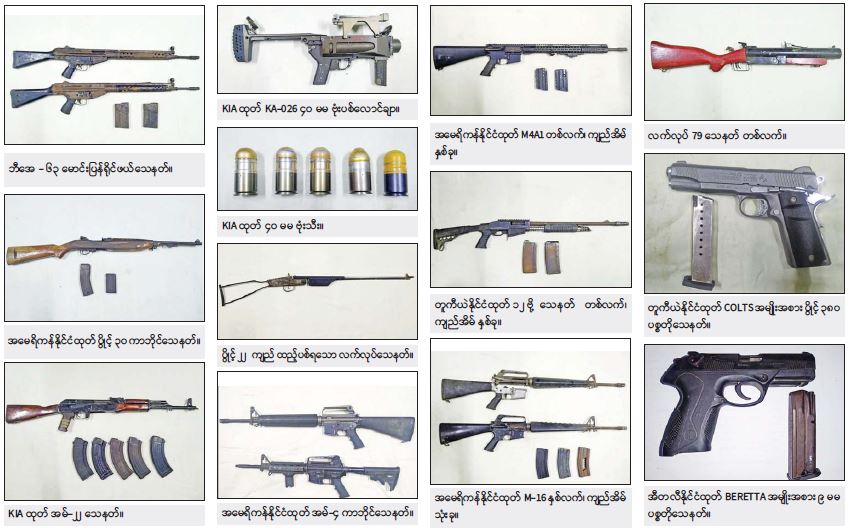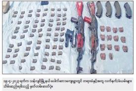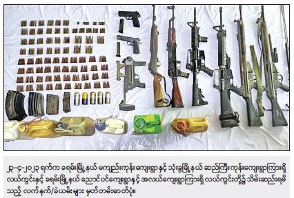ဖမ်းဆီးရမိတရားခံ ထက်ရဲလင်း (ခ) အေးမောင်၏ ထွက်ဆိုချက်အရ ဧပြီလ ၂၃ ရက် နံနက်ပိုင်းတွင် ခရမ်းမြို့နယ်၊ မကျည်းကုန်းကျေးရွာနှင့် သုံးခွမြို့နယ်၊ ဆည်ကြီးကုန်းကျေးရွာအကြားရှိ လယ်ကွင်းအတွင်းသိုဝှက်မြှုပ်နှံထားသော BA-63၂ လက်၊ ကျည်အိမ် ၂ ခု၊ ၇.၆၂ ကျည် ၂၅ တောင့်တို့အားလည်းကောင်း၊ ခရမ်းမြို့နယ်၊ ညောင်ပင် ကျေးရွာနှင့် အလယ်ကျေးရွာအကြားရှိ လယ်ကွင်းအတွင်း သိုဝှက်မြှုပ်နှံ ထားသော ပွိုင့်-၃၈၀ ပစ္စတို ၁ လက်၊ Beretta ပစ္စတို ၁ လက်၊ M-4 ကာဘိုင် ၂ လက်၊ M-22 ၁ လက်၊ ပွိုင့်-၃၀ ကာဘိုင် ၁ လက်၊ ၄၀ မမ ဗုံးပစ်လောင်ချာ ၁ လက်၊ ပွိုင့်-၂၂ လက်လုပ်သေနတ် ၁ လက်၊ ပွိုင့်-၃၈၀ ကျည် ၇ တောင့်၊ ၉ မမ ကျည် ၈ တောင့်၊ ပွိုင့်-၃၀ ကျည် ၂၅ တောင့်၊ ၅.၅၆ ကျည် ၁၂၀ တောင့်၊ ၇.၆၂ ကျည် ၂၀၀ တောင့်၊ ၄၀ မမ ဗုံးသီး ၅ လုံး၊ ပစ္စတိုကျည်အိမ် ၂ ခု၊ ပွိုင့်-၃၀ ကာဘိုင်ကျည်အိမ်(အရှည်/အတို) ၂ ခု၊ M-4 ကာဘိုင်ကျည်အိမ် ၅ ခု၊ M-22 ကျည်အိမ် ၅ ခု၊ လက်လုပ်လက်ပစ်ဗုံး ၆ လုံး တို့အားလည်းကောင်း၊ ဧပြီလ ၂၄ ရက် ညပိုင်းတွင် ခရမ်းမြို့နယ်၊ ကန်သာကျေးရွာ၏ အနောက်ဘက်ရှိ ကောက်ရိုးပုံအတွင်းမှ M-16 ၂ လက်၊ M4A1 ၁ လက်၊ ၁၂ ဗို့ ၁ လက်၊ ၄၀ မမ လက်လုပ်ဗုံးပစ်လောင်ချာ ၁ လက်၊ ပွိုင့်-၃၈၀ ကျည် ၂၆ တောင့်၊ ၉ မမ ကျည် ၆၈ တောင့်၊ ၅.၅၆ ကျည် ၄၈၀ တောင့်၊ ၇.၆၂ ကျည် ၁၉၆ တောင့်၊ ၁၂ ဗို့ကျည် ၄၀ တောင့်၊ ၄၀ မမ ဗုံးသီး ၁၉ လုံး၊ စနိုက်ပါကျည်အိမ် ၁ ခု၊ M-22 ကျည်အိမ် ၁ ခု၊ M-16 ကျည်အိမ် ၃ ခု၊ ၁၂ ဗို့ကျည်အိမ် ၂ ခု၊ M4A1 ကျည်အိမ် ၂ ခုတို့အားလည်းကောင်း ဖော်ထုတ်သိမ်းဆည်းရမိခဲ့သည်။