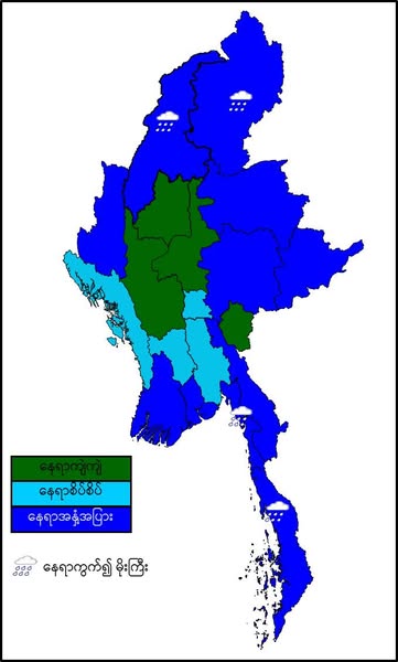 နောက် ၂ ရက်အတွက်ခန့်မှန်းချက်။ ရန်ကုန်တိုင်းဒေသကြီး၊ ပဲခူးတိုင်းဒေသကြီး၊ စစ်ကိုင်းတိုင်းဒေသကြီးအထက်ပိုင်း၊ ဧရာဝတီတိုင်းဒေသကြီး၊ ကချင်ပြည်နယ်၊ ချင်းပြည်နယ်၊ မွန်ပြည်နယ်နှင့် ရခိုင်ပြည်နယ်တို့တွင် မိုးပိုနေမည်။
