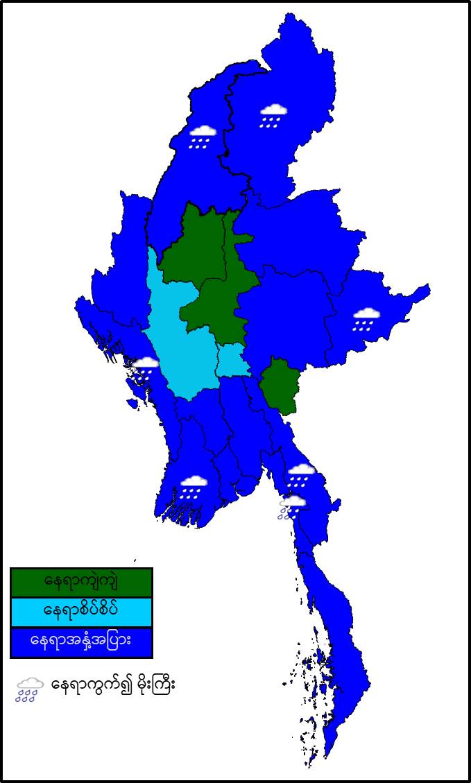 မနက်ဖြန်နံနက်အထိခန့်မှန်းချက်။ မန္တလေးတိုင်းဒေသကြီး၊ စစ်ကိုင်းတိုင်းဒေသကြီးအောက်ပိုင်းနှင့် ကယားပြည်နယ်တို့တွင် နေရာကျဲကျဲ၊ နေပြည်တော်နှင့် မကွေးတိုင်းဒေသကြီးတို့တွင် နေရာစိပ်စိပ်နှင့် ကျန်တိုင်းဒေသကြီးနှင့် ပြည်နယ်တို့တွင် နေရာအနှံ့အပြား မိုးထစ်ချုန်းရွာပြီး၊ စစ်ကိုင်းတိုင်းဒေသကြီးအထက်ပိုင်း၊ ဧရာဝတီတိုင်းဒေသကြီး၊ ကရင်ပြည်နယ်၊ မွန်ပြည်နယ်၊ ရခိုင်ပြည်နယ်နှင့် ရှမ်းပြည်နယ်(အရှေ့ပိုင်း)တို့တွင် နေရာကွက်၍ မိုးကြီးနိုင်ပါသည်။ ရွာရန်ရာနှုန်းပြည့် ဖြစ်ပါသည်။
