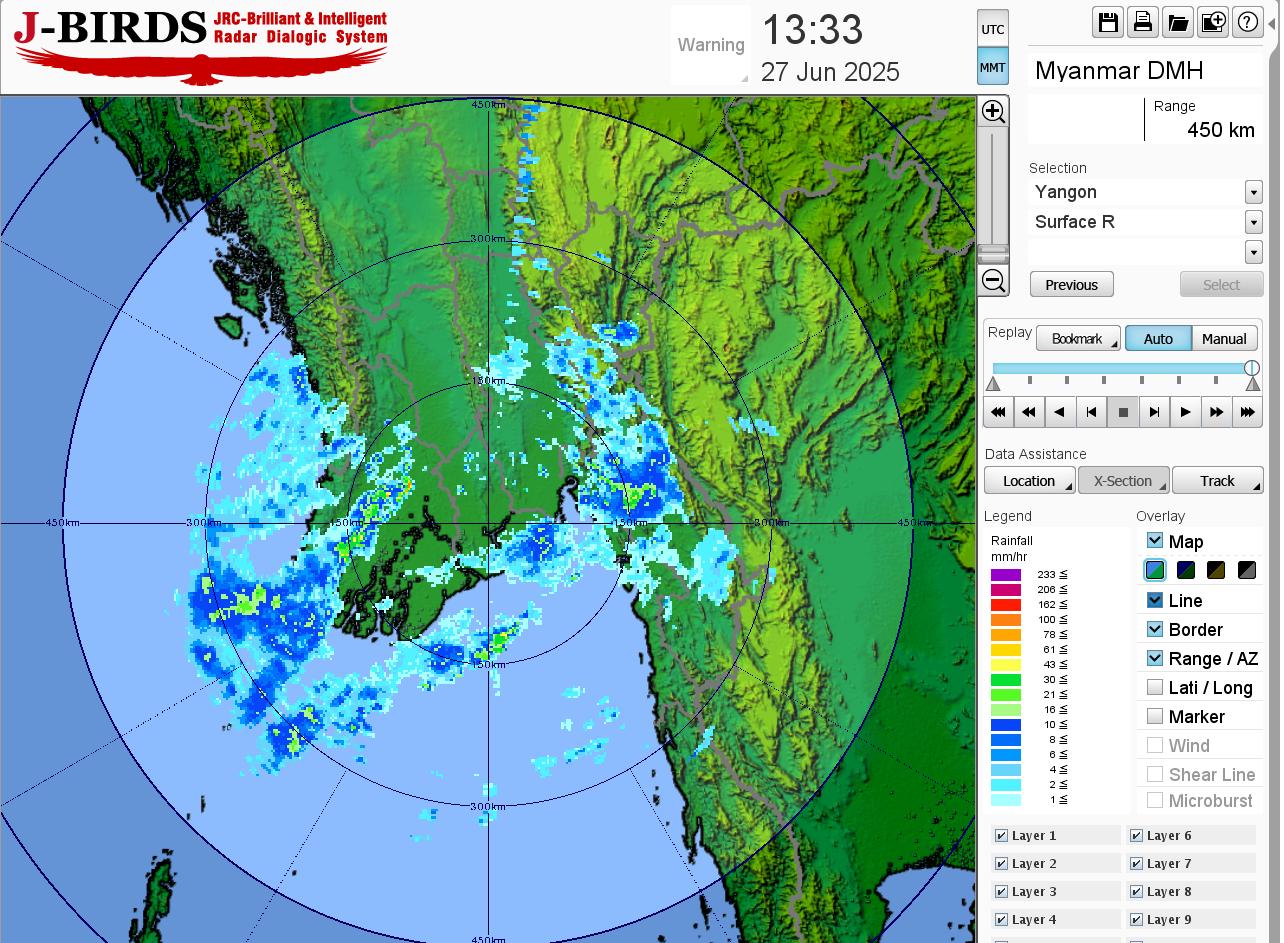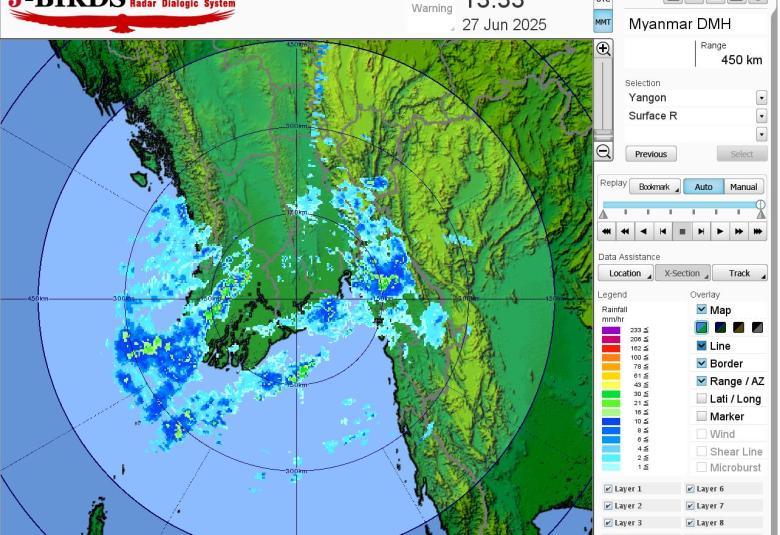 မိုးတိမ်တောင်ဖြစ်ပေါ်မှုအခြေအနေ။ ရန်ကုန်တိုင်းဒေသကြီး၊ ပဲခူးတိုင်းဒေသကြီး၊ စစ်ကိုင်းတိုင်းဒေသကြီးအထက်ပိုင်း၊ ဧရာဝတီတိုင်းဒေသကြီး၊ တနင်္သာရီတိုင်းဒေသကြီး၊ မွန်ပြည်နယ်နှင့် ရှမ်းပြည်နယ်တို့တွင် မိုးတိမ်တောင်များ ဖြစ်ထွန်းလျက်ရှိပြီး၊ အဆိုပါ မိုးတိမ်တောင်များ ရွေ့လျားရာ နေရာတစ်လျှောက်တွင် မိုးရွာသွန်းခြင်းနှင့်အတူ လေပြင်းတိုက်ခတ်ခြင်း၊ မိုးထစ်ချုန်းခြင်း၊ မိုးကြိုးပစ်ခြင်း၊ လျှပ်စီးလက်ခြင်းနှင့် မိုးသီးကြွေခြင်းစသည့် မိုးလေဝသဖြစ်စဉ်များ ဖြစ်ပေါ်နိုင်ပါသဖြင့် ကြိုတင်သတိပြုနိုင်ပါရန် အကြံပြုအပ်ပါသည်။