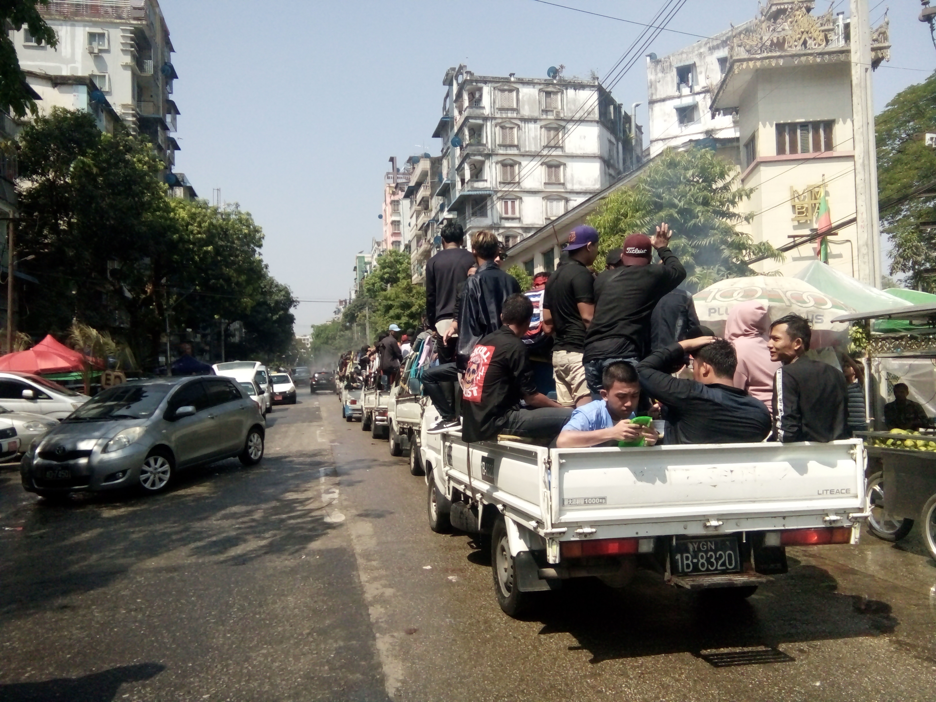 ရန်ကုန်တိုင်းဒေသကြီး ပုဇွန်တောင်မြို့နယ်အတွင်း သင်္ကြန်အကြတ်နေ့၌ အေးချမ်းပျော်ရွှင်စွာ ရေပက်ကစားသူများနှင့် စည်ကားလျက်ရှိ