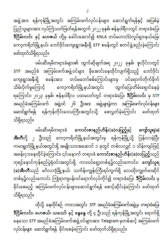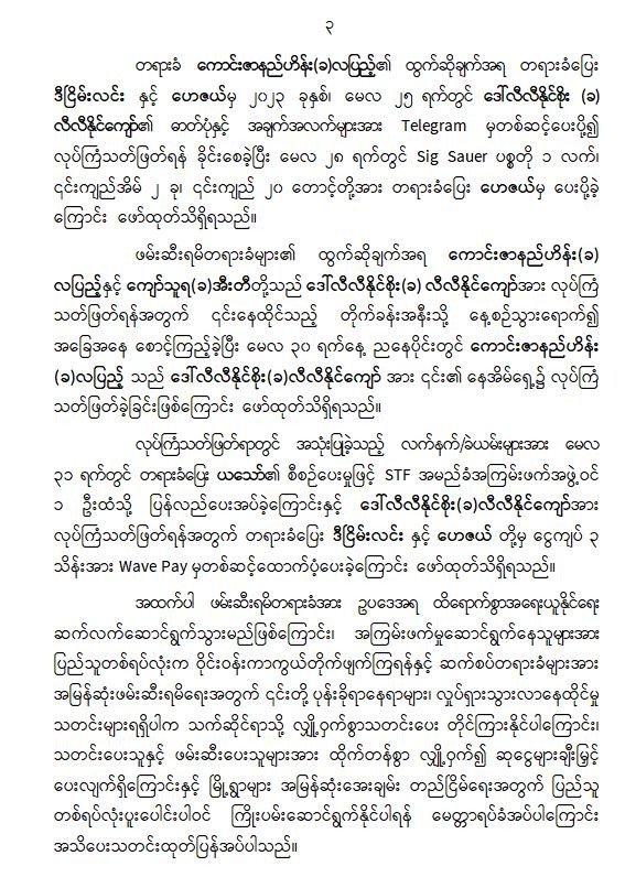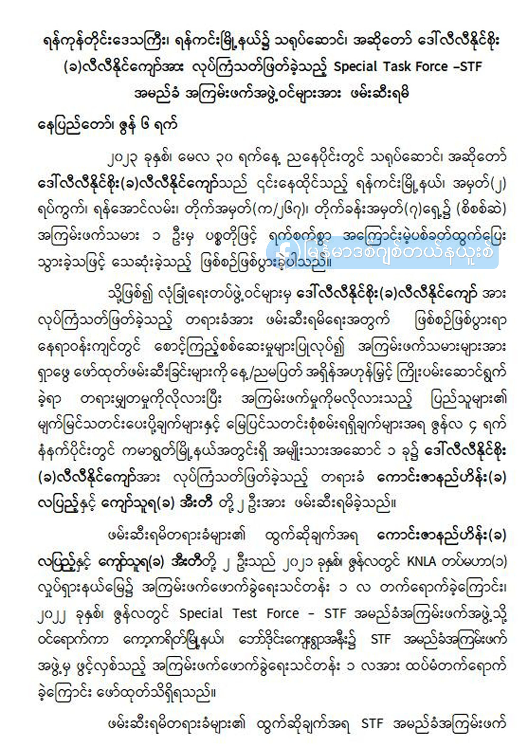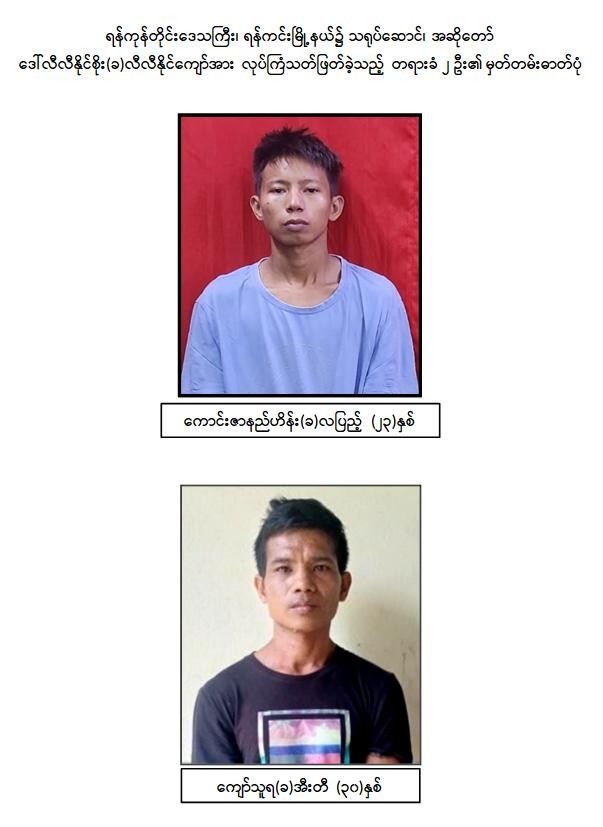 ရန်ကုန်တိုင်းဒေသကြီး၊ ရန်ကင်းမြို့နယ်၌ သရုပ်ဆောင်၊ အဆိုတော် ဒေါ်လီလီနိုင်စိုး (ခ)လီလီနိုင်ကျော်အား လုပ်ကြံသတ်ဖြတ်ခဲ့သည့် Special Task Force –STF အမည်ခံ အကြမ်းဖက်အဖွဲ့ဝင်များအား ဖမ်းဆီးရမိ