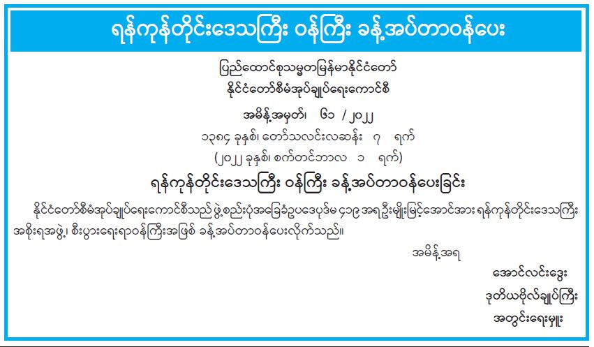ရန်ကုန်တိုင်းဒေသကြီး ဝန်ကြီး ခန့်အပ်တာဝန်ပေးခြင်း