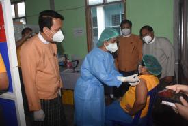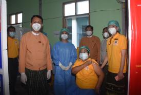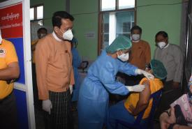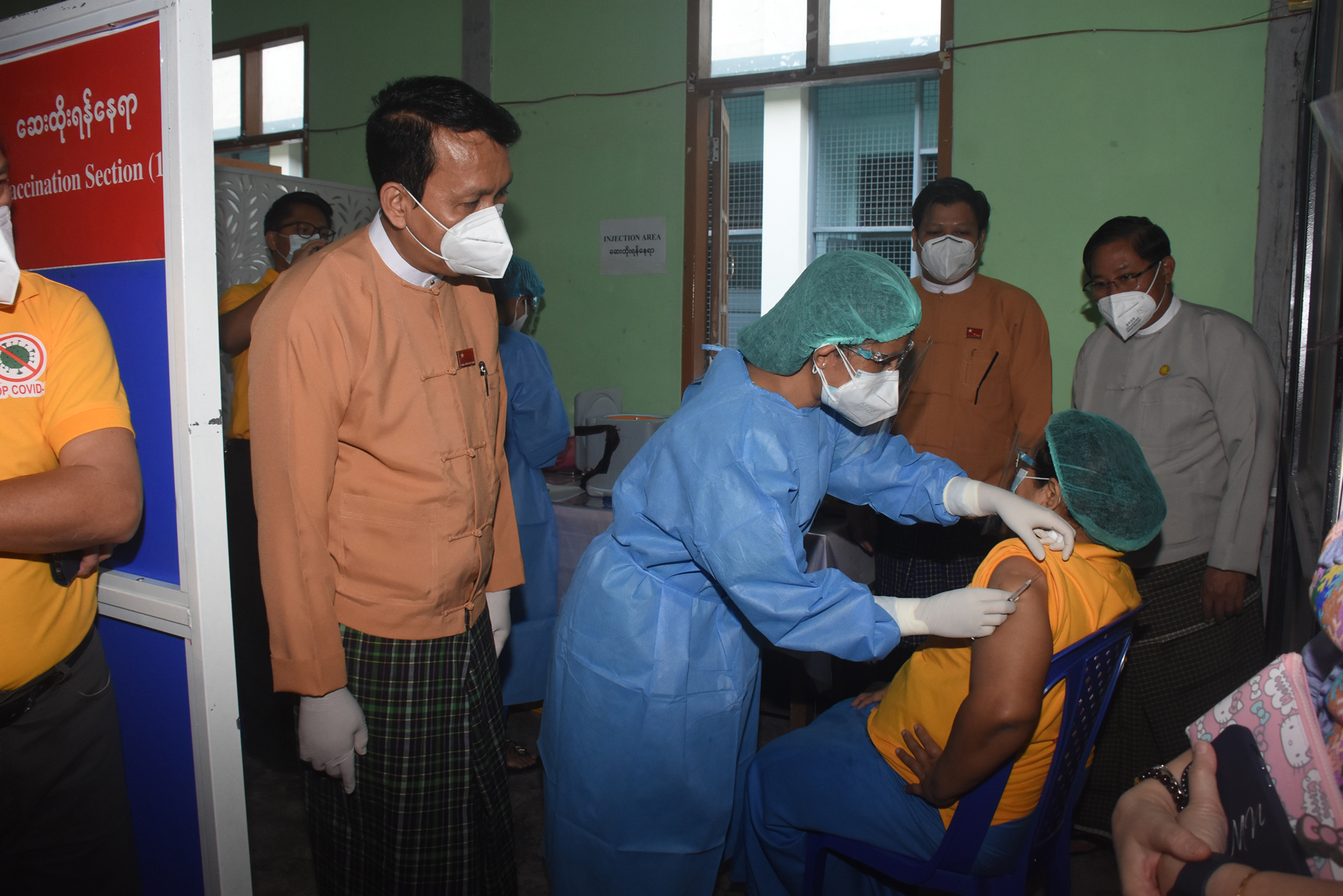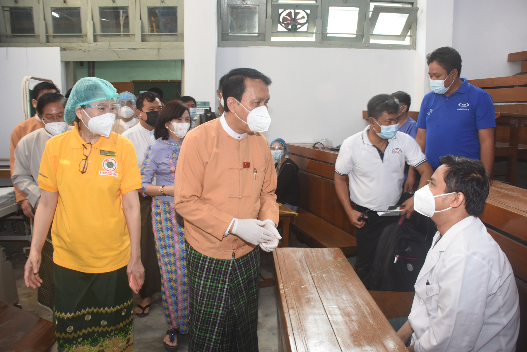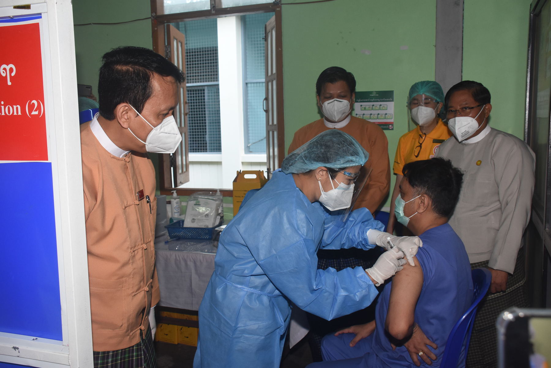 ရန်ကုန်တိုင်းဒေသကြီးအတွင်းရှိ ကျန်းမာရေးဝန်ထမ်းများအား ကိုဗစ်-၁၉ ကာကွယ်ဆေး စတင်ထိုးနှံခြင်း အခမ်းအနားကို ယနေ့ နံနက် ၈ နာရီက ရန်ကုန်ပြည်သူ့ဆေးရုံကြီးအတွင်းရှိ သူနာပြုသင်တန်းကျောင်းတွင် ပြုလုပ်ရာ ရန်ကုန်တိုင်းဒေသကြီးဝန်ကြီးချုပ် ဦးဖြိုးမင်းသိန်း တက်ရောက်ကြည့်ရှုအားပေးနေသည်ကို တွေ့ရစဉ်။
