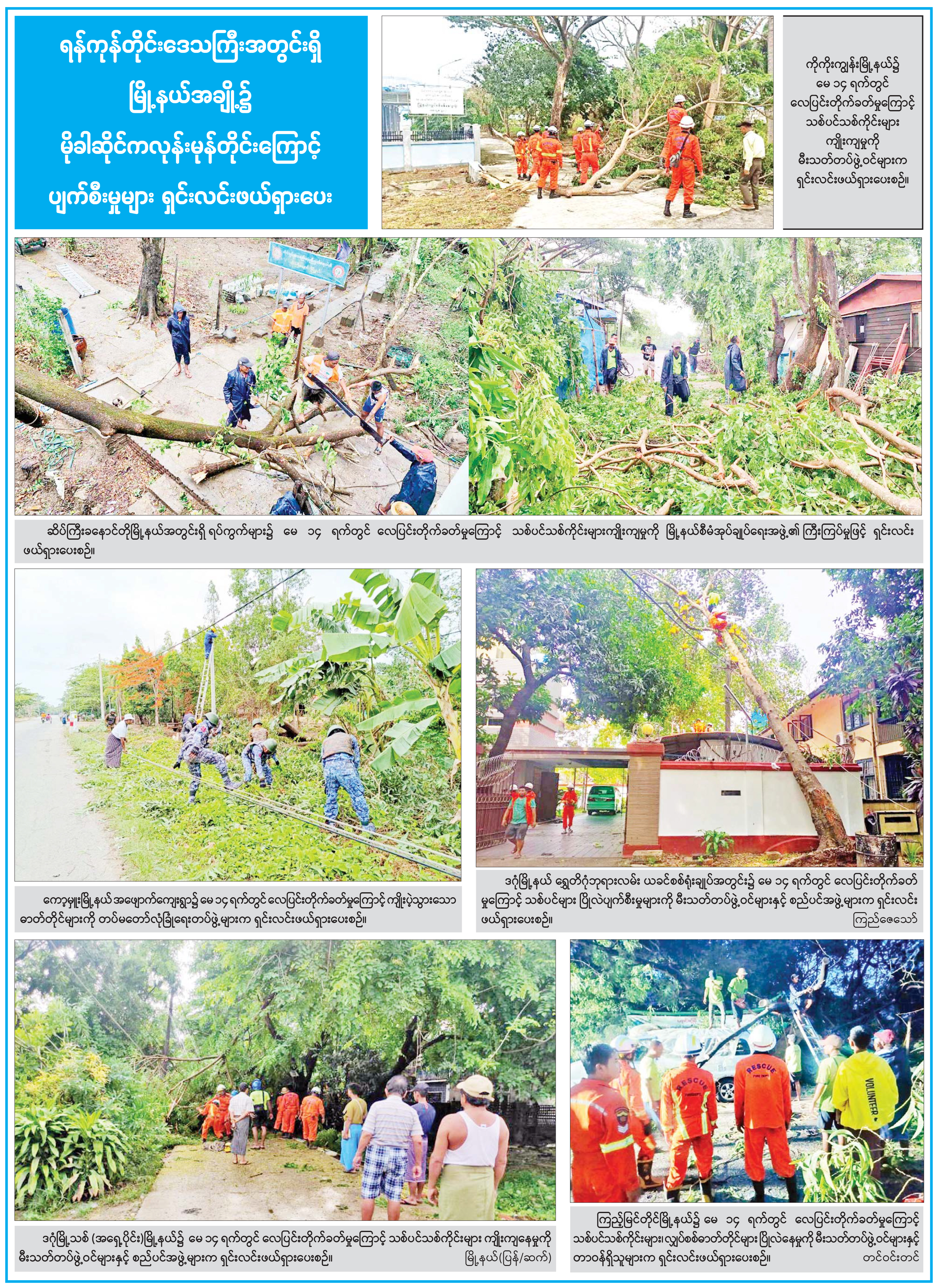 ရန်ကုန်တိုင်းဒေသကြီးအတွင်းရှိ မြို့နယ်အချို့၌ မိုခါဆိုင်ကလုန်းမုန်တိုင်းကြောင့် ပျက်စီးမှုများ ရှင်းလင်းဖယ်ရှားပေး
