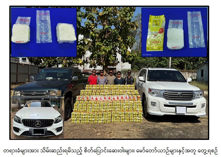 ရန်ကုန်တိုင်းဒေသကြီးတွင်  မူးယစ်မှောင်ခိုဂိုဏ်းအဖွဲ့အား ငွေကျပ် ၉၆ ဘီလီယံကျော် တန်ဖိုးရှိ အိုက်စ်(မက်သ်အဖက်တမင်း) ၃ တန်ကျော်၊ ကက်တမင်း ကီလို ၂၀၀ တို့နှင့်အတူ ဖမ်းဆီးရမိခဲ့ကြောင်း မြန်မာနိုင်ငံရဲတပ်ဖွဲ့မှ သိရသည်။