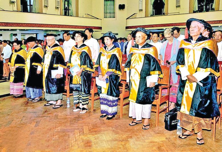 မြန်မာနိုင်ငံ ရန်ကုန်တက္ကသိုလ်ကြီးသည်လည်း ထို့အတူ “ဂုဏ်ပြုထိုက်သူ ရဟန်းပုဂ္ဂိုလ်၊ လူပုဂ္ဂိုလ်”များ အား ရန်ကုန်တက္ကသိုလ်စတင်တည်ထောင်သည့်ကာလမှစ၍ နှစ်တစ်ရာကာလအတွင်း ထိုက်ထိုက်တန်တန် “ဂုဏ်ထူးဆောင်ဘွဲ့များ”ကို ဆက်ကပ်ခြင်း(ရဟန်းပုဂ္ဂိုလ်)၊ ပေးအပ်ချီးမြှင့်ခြင်း (လူပုဂ္ဂိုလ်)တို့ကို မွန်မြတ်သည့်အစဉ် အလာကောင်းတစ်ရပ်အဖြစ် ဆောင်ရွက်ဖြစ်ခဲ့သည်ကို ကောင်းစွာလေ့လာတွေ့ရှိ မှတ်သားထားမိပါသည်။
