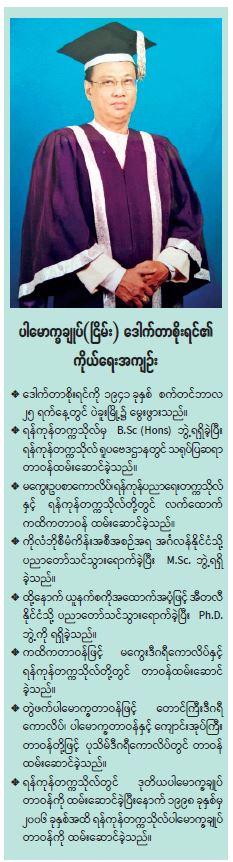 တကယ်က ဆရာက ၂၀၀၁ ခုနှစ်မှာ အသက် ၆၀ ပြည့်တယ်။ ဒါပေမဲ့လည်း အဲဒီခေတ်က ပညာရေး ပြုပြင်ပြောင်းလဲရေးလုပ်တဲ့နေရာမှာ ပညာရှင်တွေ လိုတယ်ဆိုတဲ့ အစိုးရရဲ့မူကြောင့် ဆရာတို့ကို ပင်စင်ယူခွင့်မပေးဘဲ အဲဒီရာထူးနဲ့ပဲ နှစ်စဉ်ခန့်ထားတယ်။ ဒါကြောင့် ပါမောက္ခချုပ်သက်တမ်း ရှစ်နှစ်လောက် လုပ်ခဲ့ရတယ်။