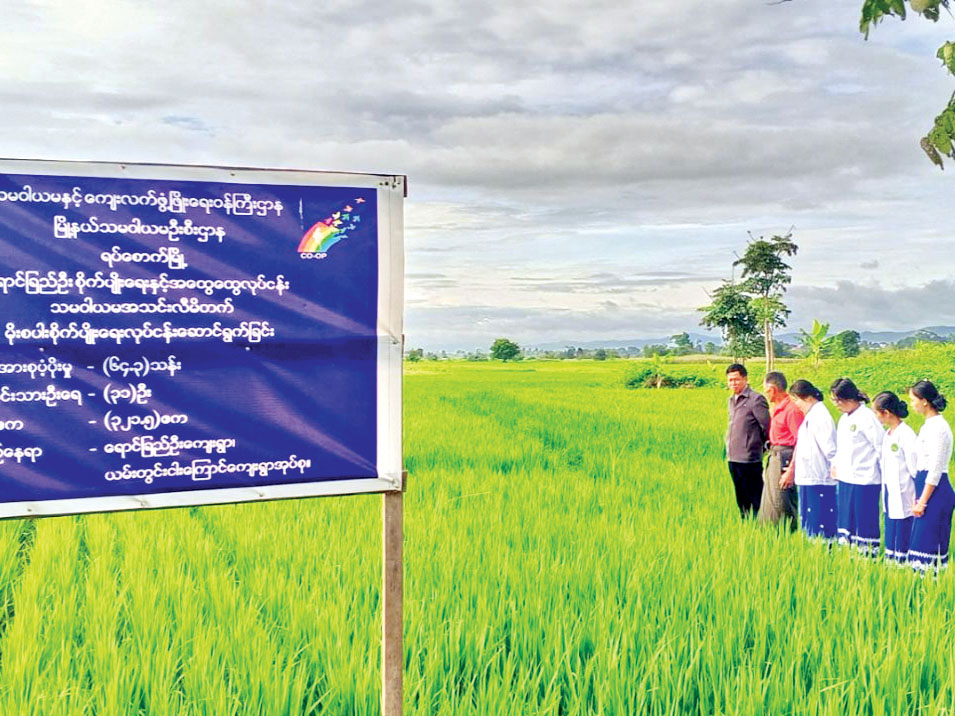 ရှမ်းပြည်နယ် (တောင်ပိုင်း) ရပ်စောက်မြို့နယ် ရောင်ခြည်ဦး ကျေးရွာရှိ စီမံကိန်းသီးနှံ(သက်တံ့ ရောင်စီမံကိန်း) စိုက်ပျိုးလျက်ရှိသည့် ရောင်ခြည်ဦးစိုက်ပျိုးရေးနှင့် အထွေထွေလုပ်ငန်း သမဝါယမ အသင်းလီမိတက်မှ မိုးစပါး စိုက်ပျိုးထားရှိမှု အခြေအနေအား ယနေ့နံနက်ပိုင်းတွင် တာဝန် ရှိသူများက ကွင်းဆင်းကြည့်ရှုသည်။