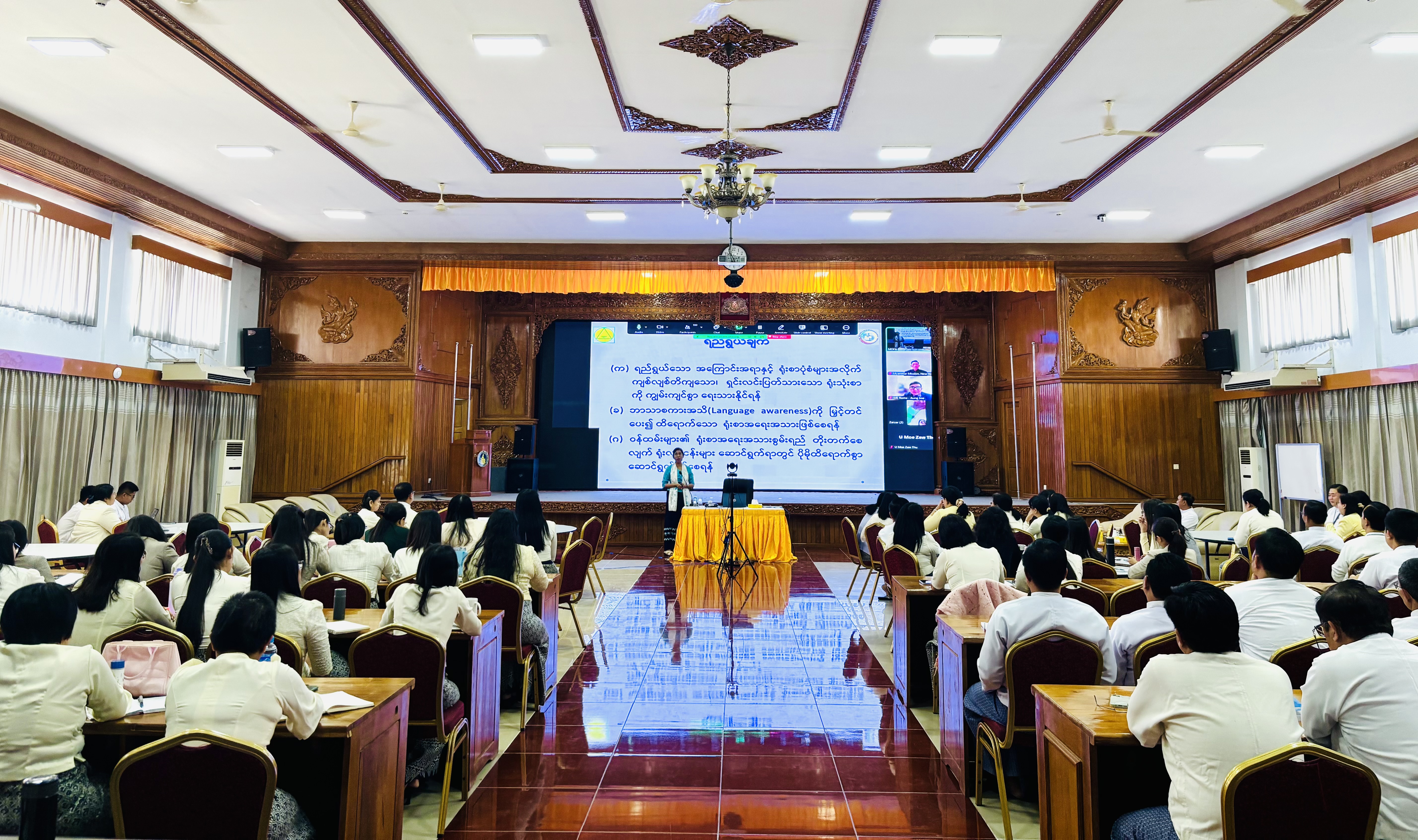 နိုင်ငံခြားရေးဝန်ကြီးဌာနမှ အရာထမ်းများအတွက် ရုံးသုံးမြန်မာစာရေးနည်းအလုပ်ရုံ ဆွေးနွေးပွဲကို ယနေ့တွင် နေပြည်တော်ရှိ နိုင်ငံခြားရေးဝန်ကြီးဌာန လောကနတ်ခန်းမ၌ ကျင်းပရာ နေပြည်တော်ရှိ အရာထမ်းများ တက်ရောက်ကြပြီး ပြည်ပရှိ မြန်မာသံရုံး၊ အဖွဲ့ရုံး၊ ကောင်စစ်ဝန်ချုပ်ရုံးများရှိ အရာထမ်းများက Video Conferencing ဖြင့် တက်ရောက်ကြသည်။