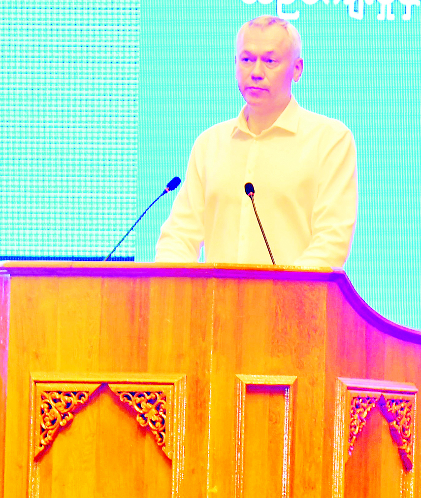 ယင်းနောက် နိုဗိုစီဗစ်ဒေသအုပ်ချုပ်ရေးမှူးက နှုတ်ခွန်းဆက်စကား ပြန်လည်ပြောကြားရာတွင် နိုင်ငံတော်ယာယီသမ္မတ နိုင်ငံတော်လုံခြုံရေးနှင့် အေးချမ်းသာယာရေးကော်မရှင်ဥက္ကဋ္ဌ ဗိုလ်ချုပ်မှူးကြီး မင်းအောင်လှိုင်၏ ဖိတ်ကြားမှုအရ ယခုကဲ့သို့ ထူးခြားလှပသည့် မြန်မာနိုင်ငံသို့ လာရောက်လည်ပတ်ခွင့်ရရှိသည့်အတွက် စိတ်ရင်းမှန်ဖြင့် ကျေးဇူးတင်ရှိပါကြောင်း၊ မိမိတို့  ဆိုက်ဘေးရီးယားလူမျိုးများကို ဧည့်ဝတ်ကျေပွန်စွာ ကြိုဆိုဧည့်ခံမှု၊ မိမိတို့၏ ယဉ်ကျေးမှုနှင့် အနုပညာအပေါ် စိတ်ဝင်စားမှုများအတွက်လည်း ကျေးဇူးတင်ရှိပါကြောင်း၊ မြန်မာနိုင်ငံ၏ ဘာသာရေးနှင့် ယဉ်ကျေးမှုအမွေအနှစ်များသည် ကြွယ်ဝမှုနှင့် နက်ရှိုင်းမှုတို့၌  ထင်ရှားပေါ်လွင် အံ့သြဖွယ်ရာဖြစ်ပြီး ယခုကဲ့သို့ကြွယ်ဝမှုများသည် မြန်မာနိုင်ငံသားတို့၏ ရိုးသားပွင့်လင်းမှုများကို တွေ့မြင်စေရပါကြောင်း၊ ရုရှားဖက်ဒရေးရှင်းနိုင်ငံ၏ နယ်မြေပေါ်တွင် လူမျိုးပေါင်းတစ်ရာကျော်မျှ နေထိုင်ကြသော်လည်း၊ မိမိတို့အားလုံးသည် တူညီသောသမိုင်းကြောင်းနှင့် တူညီသော ကံကြမ္မာတို့ဖြင့် စည်းလုံးညီညွတ်လျက်ရှိပါကြောင်း။