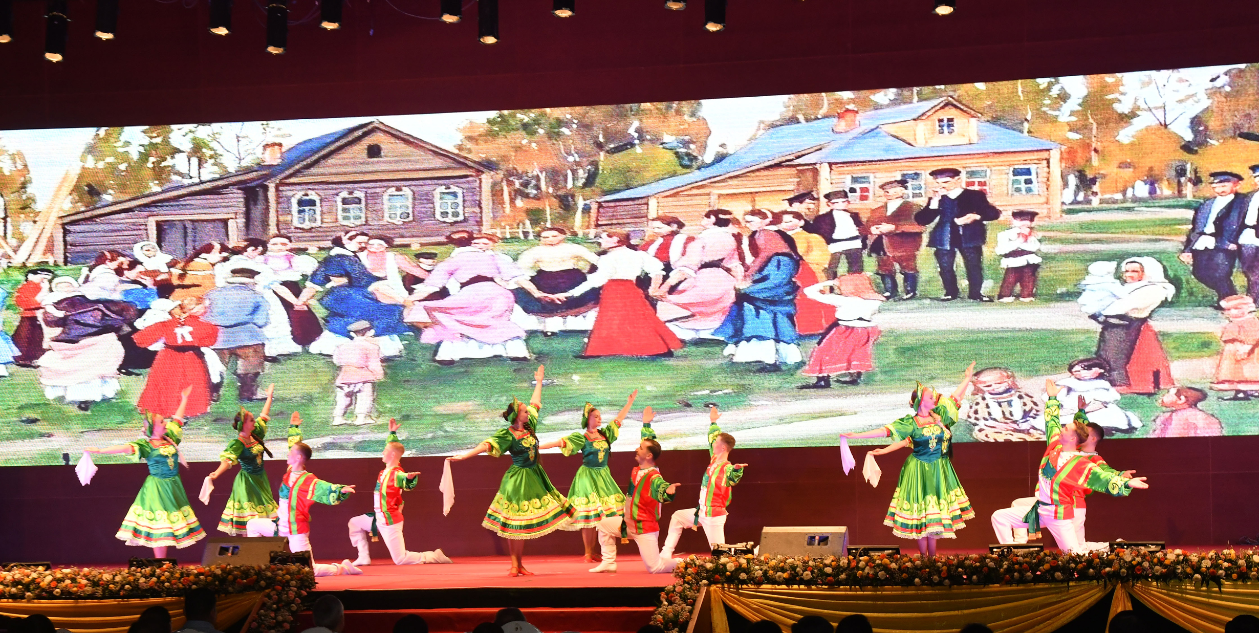 ဦးစွာ “မဟာရုရှားနှင့်  ဆိုက်ဘေးရီးယား အမည်ရသည့် ဂုဏ်ပြုဖျော်ဖြေပွဲ အခမ်းအနားကို နှစ်နိုင်ငံ နိုင်ငံတော်သီချင်းများ ဖွင့်လှစ်ကာ အလေးပြု၍ ဖွင့်လှစ်သည်။