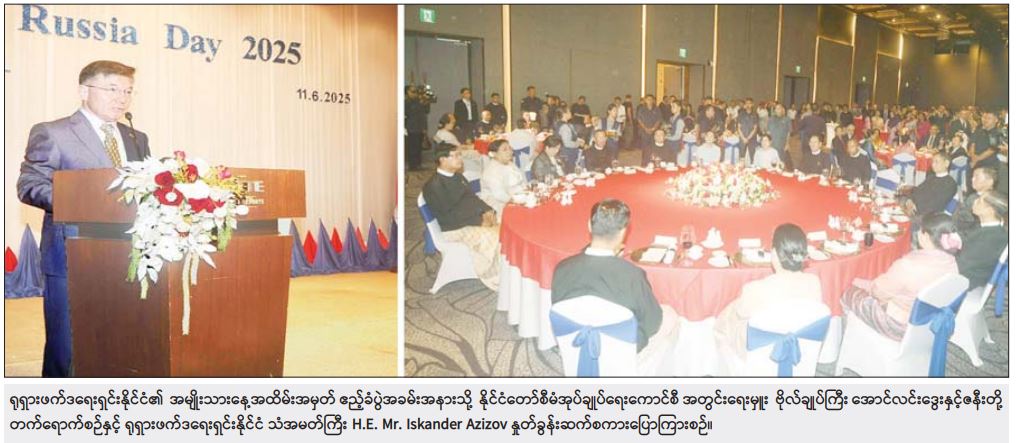 ရန်ကုန်မြို့အခြေစိုက် ရုရှားဖက်ဒရေးရှင်းနိုင်ငံသံရုံးက ကျင်းပသည့် ရုရှားဖက်ဒရေးရှင်းနိုင်ငံ၏ အမျိုးသားနေ့အထိမ်းအမှတ် ဧည့်ခံပွဲအခမ်းအနားကို ယနေ့ညပိုင်းတွင် ရန်ကုန်မြို့ Lotte Hotel ၌ကျင်းပရာ နိုင်ငံတော် စီမံအုပ်ချုပ်ရေးကောင်စီ အတွင်းရေးမှူး ဗိုလ်ချုပ်ကြီးအောင်လင်းဒွေးနှင့်ဇနီးတို့ တက်ရောက်သည်။
