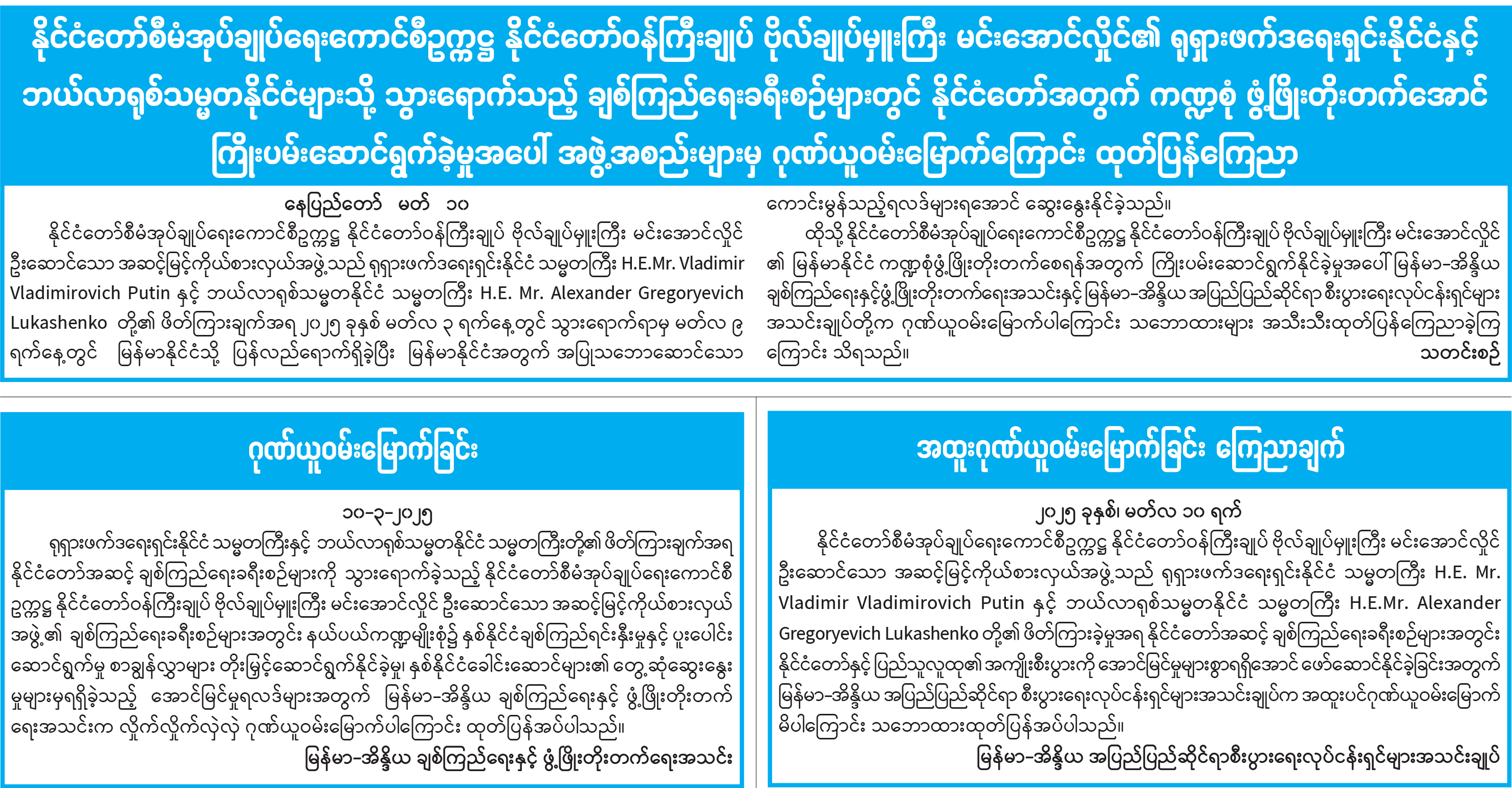 နိုင်ငံတော်စီမံအုပ်ချုပ်ရေးကောင်စီဥက္ကဋ္ဌ နိုင်ငံတော်ဝန်ကြီးချုပ် ဗိုလ်ချုပ်မှူးကြီး မင်းအောင်လှိုင်၏ ရုရှားဖက်ဒရေးရှင်းနိုင်ငံနှင့် ဘယ်လာရုစ်သမ္မတနိုင်ငံများသို့ သွားရောက်သည့် ချစ်ကြည်ရေးခရီးစဉ်များတွင် နိုင်ငံတော်အတွက် ကဏ္ဍစုံ ဖွံ့ဖြိုးတိုးတက်အောင် ကြိုးပမ်းဆောင်ရွက်ခဲ့မှုအပေါ် အဖွဲ့အစည်းများမှ ဂုဏ်ယူဝမ်းမြောက်ကြောင်း ထုတ်ပြန်ကြေညာ