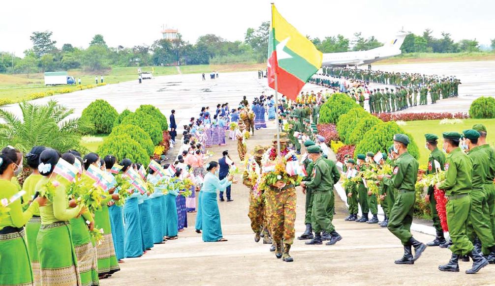 ရုရှားဖက်ဒရေးရှင်းနိုင်ငံ၊ မော်စကိုမြို့တွင် ကျင်းပပြုလုပ်သည့် International Army Games-2022 ပြိုင်ပွဲသို့ ဝင်ရောက်ယှဉ်ပြိုင်ခဲ့ကြသော မြန်မာ့တပ်မတော် ကိုယ်စားလှယ် အဖွဲ့သည် ယနေ့နံနက်ပိုင်းတွင် နေပြည်တော်သို့ ပြန်လည်ရောက်ရှိလာရာ ညှိနှိုင်းကွပ်ကဲ ရေးမှူး(ကြည်း၊ရေ၊လေ) ဗိုလ်ချုပ်ကြီး မောင်မောင်အေး၊ စစ်ရေးချုပ် ဒုတိယဗိုလ်ချုပ်ကြီး မျိုးဇော်သိန်း၊ ကာကွယ်ရေးဦးစီးချုပ်ရုံး(ကြည်း)မှ တပ်မတော်အရာရှိကြီးများ၊ နေပြည်တော် တိုင်းစစ်ဌာနချုပ် တိုင်းမှူးဗိုလ်ချုပ်ဇော်ဟိန်းနှင့် တာဝန်ရှိသူများ၊ အရာရှိ/စစ်သည်၊ မိသားစုများက လေဆိပ်တွင် သောင်းသောင်းဖျဖျ ကြိုဆိုကြသည်။
