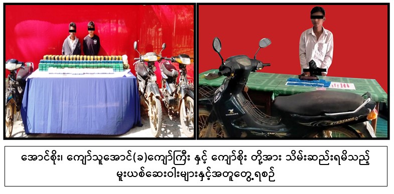 အလားတူ ယင်းနေ့ မွန်းလွဲ ၂ နာရီတွင် မန္တလေးတိုင်းဒေသကြီးရဲတပ်ဖွဲ့မှ တပ်ဖွဲ့ဝင်များ ပါဝင်သောပူးပေါင်း အဖွဲ့သည် သာစည်မြို့၊ အမှတ်(၄)ရပ်ကွက်တွင် ကျော်စိုး မောင်းနှင်လာသည့် ဆိုင်ကယ်ကို ရပ်တန့်စစ်ဆေးရှာဖွေရာ စိတ်ကြွရူးသွပ်ဆေးပြား ၃,၂၀၀ ကိုလည်းကောင်း၊ အောက်တိုဘာ ၃၀ ရက် နံနက် ၈ နာရီတွင် မူးယစ်ဆေးဝါး တားဆီးနှိမ်နင်းရေး ရဲတပ်ဖွဲ့မှ တပ်ဖွဲ့ဝင်များပါဝင်သော ပူးပေါင်းအဖွဲ့သည် ပုသိမ်ကြီးမြို့နယ်၊ ကျောက်ချောကျေးရွာရှိ ၁၆ မိုင် ပူးပေါင်းစစ်ဆေးရေးစခန်းတွင် စည်သူလင်း မောင်းနှင်ပြီး အောင်ဝင်း လိုက်ပါလာသည့် Light Truck အမျိုးအစား မော်တော်ယာဉ်ကို ရပ်တန့် စစ်ဆေးရှာဖွေရာ စိတ်ကြွရူးသွပ်ဆေးပြား ၉,၇၅၄ ပြားနှင့် ဘိန်းဖြူ သုည ဒသမ ၂၂ ကီလို ကိုလည်းကောင်း သိမ်းဆည်းရမိခဲ့သဖြင့် ၎င်းတို့အား မူးယစ်ဆေးဝါးနှင့် စိတ်ကို ပြောင်းလဲစေသော ဆေးဝါးများဆိုင်ရာ ဥပဒေအရ အရေးယူထားကြောင်း သိရသည်။
