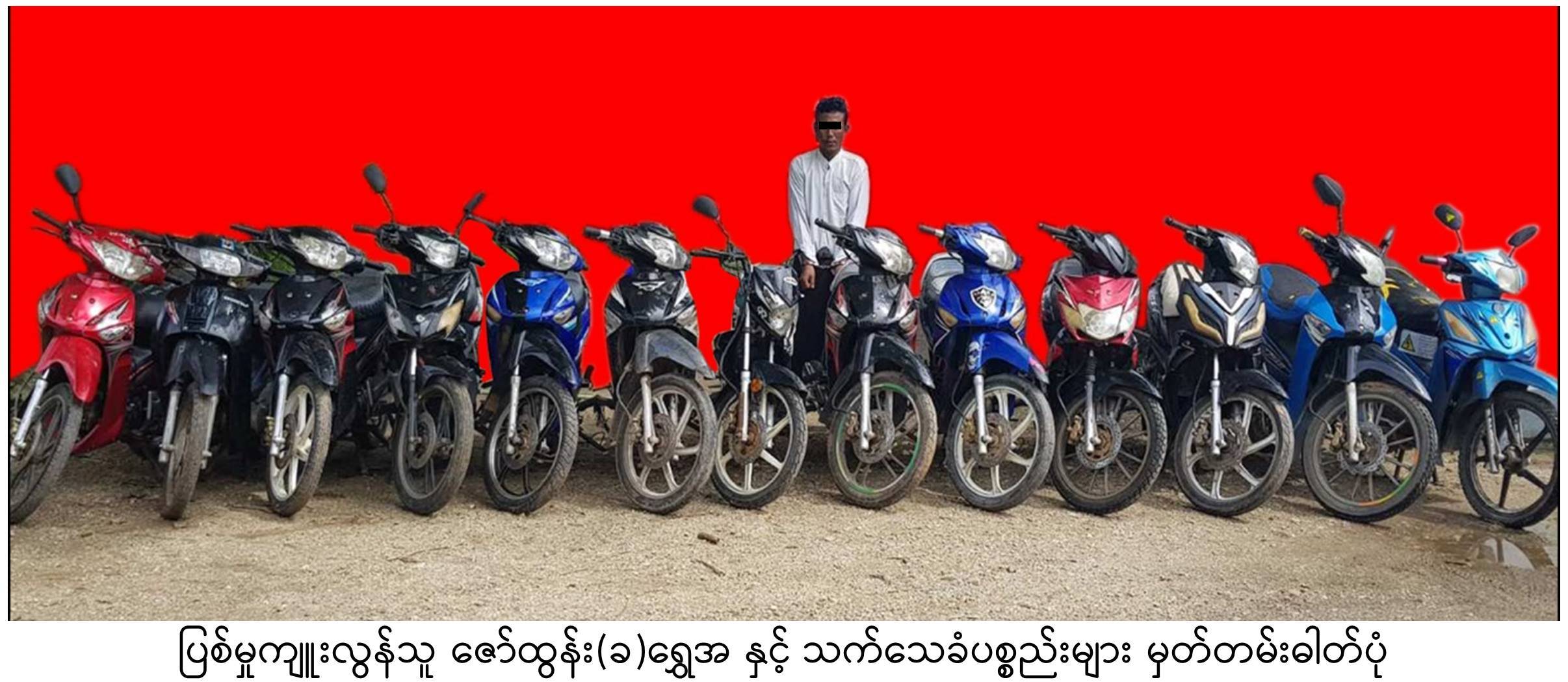 စစ်ဆေးပေါ်ပေါက်ချက်အရ အမှုမှ သက်သေခံပစ္စည်း ဆိုင်ကယ်အမျိုးမျိုး(၁၃)စီးကို ပြန်လည်သိမ်းဆည်းရရှိပြီးဖြစ်၍ ခိုးမှုကျူးလွန်သူ ဇော်ထွန်း(ခ)ရွှေအကို ဥပဒေနှင့်အညီ အမြန်တရားစွဲတင်ပို့နိုင်ရေး ဆောင်ရွက်လျက်ရှိကြောင်း သတင်းရရှိသည်။