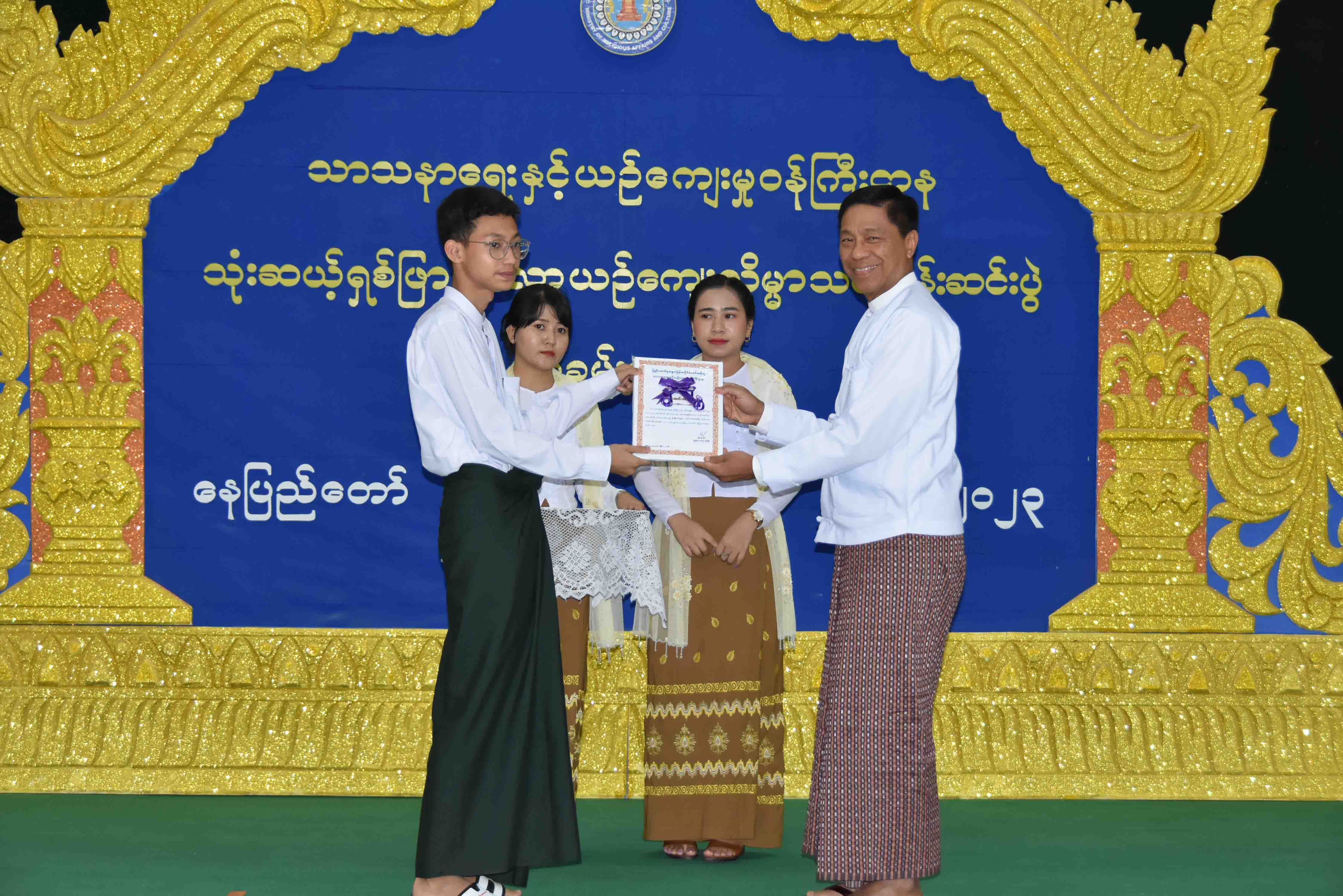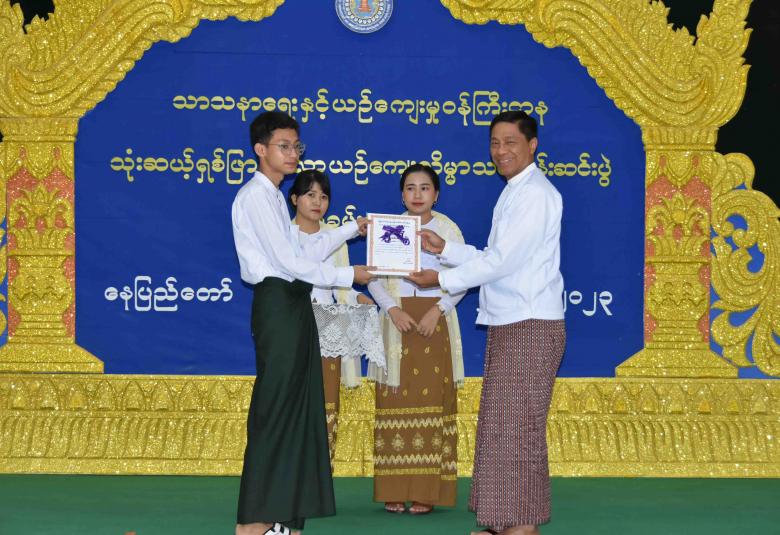 ဆက်လက်၍ ပြည်ထောင်စုဝန်ကြီးက ဗုဒ္ဓဘာသာကလျာဏယုဝအသင်း(YMBA)မှ သင်တန်း နည်းပြဆရာ ၆ ဦးတို့အား ဂုဏ်ပြုမှတ်တမ်းနှင့် ဂုဏ်ပြုလက်ဆောင်များကိုလည်းကောင်း၊ အလှူရှင် ၂ ဦးအား ဂုဏ်ပြုမှတ်တမ်းများကိုလည်းကောင်း ပေးအပ်သည်။