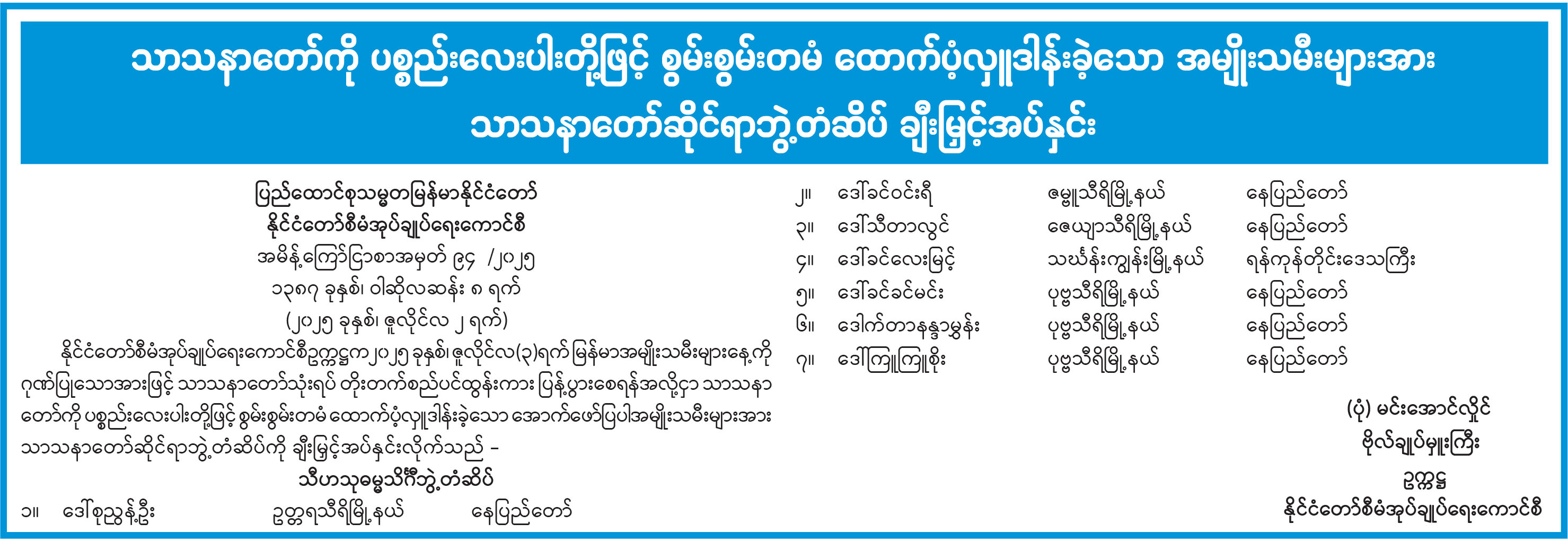 သာသနာတော်ကို ပစ္စည်းလေးပါးတို့ဖြင့် စွမ်းစွမ်းတမံ ထောက်ပံ့လှူဒါန်းခဲ့သော အမျိုးသမီးများအား သာသနာတော်ဆိုင်ရာဘွဲ့တံဆိပ် ချီးမြှင့်အပ်နှင်း