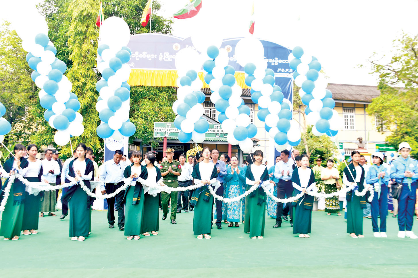 ဦးစွာ တိုင်းဒေသကြီးဝန်ကြီးချုပ် ဦးမျိုးဆွေဝင်းနှင့် အစိုးရအဖွဲ့ဝင်ဝန်ကြီးများက စာကြည့်တိုက် ဖွံ့ဖြိုးတိုးတက်ရေးနှင့် စာဖတ်ရှိန်မြှင့်တင်ရေး အခမ်းအနားကို ဖဲကြိုးဖြတ်ဖွင့်လှစ်ပေးသည်။