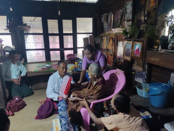 State Administration Council Member Mahn Nyein Maung visited the home of 109-year-old Daw Saw Kyi in the western ward of Pantanaw yesterday afternoon and donated provisions to her.