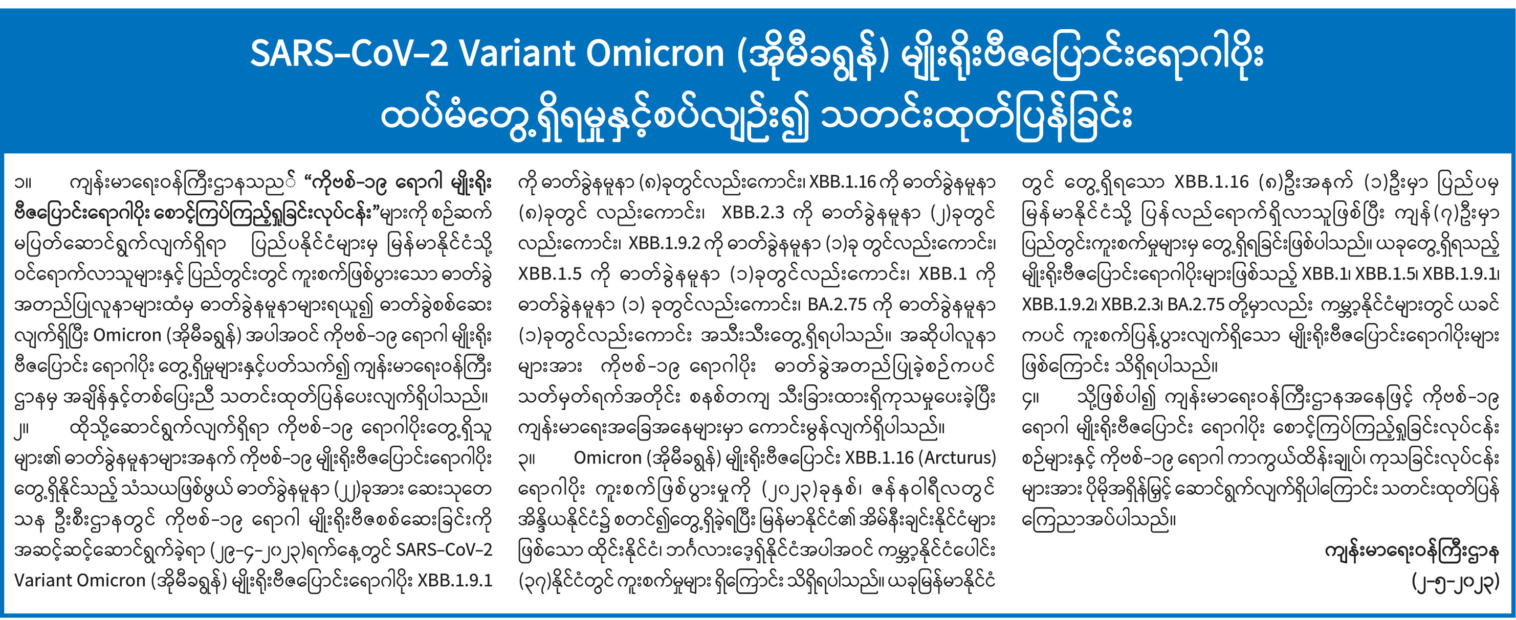 SARS-CoV-2 Variant Omicron (အိုမီခရွန်) မျိုးရိုးဗီဇပြောင်းရောဂါပိုး ထပ်မံတွေ့ရှိရမှုနှင့်စပ်လျဉ်း၍ သတင်းထုတ်ပြန်ခြင်း
