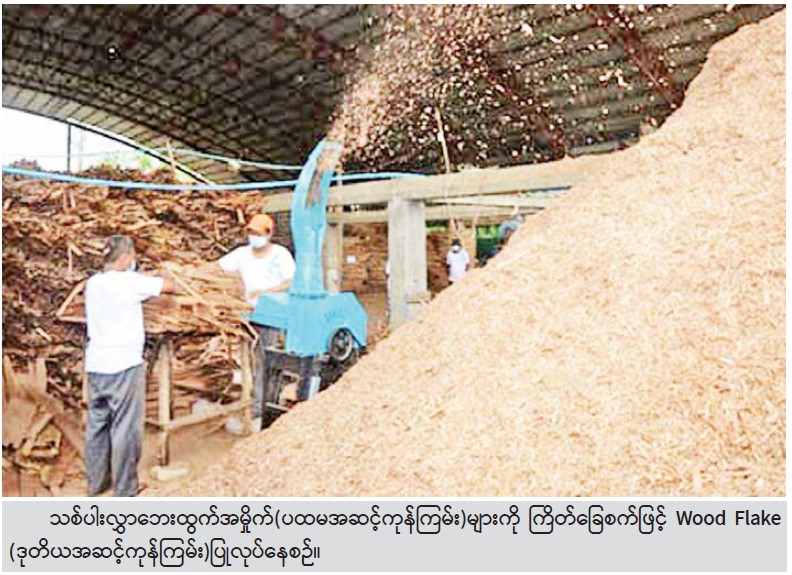နိုင်ငံတော်ဝန်ကြီးချုပ်၏ လမ်းညွှန်ချက်နှင့်အညီ မြန်မာ့သစ်လုပ်ငန်းလက်အောက်ရှိ သစ်စက်၊ သစ်အခြေခံ စက်ရုံများမှထွက်ရှိသော ဘေးထွက်ပစ္စည်းများကို ထိရောက်စွာ အသုံးချနိုင်ရေးအတွက် နည်းလမ်းရှာဖွေဆောင်ရွက်ခဲ့ရာ ကနဦးအစီအစဉ်အဖြစ် သစ်ပါးလွှာ (Veneer) ထုတ်လုပ်ရာမှ ထွက်ရှိသော သစ်ပါးလွှာ ဘေးထွက်များမှ သစ်လောင်စာ တောင့် (Wood Pellet) ထုတ်လုပ်ခြင်းကို စမ်းသပ် ဆောင်ရွက်ခဲ့ပါသည်။