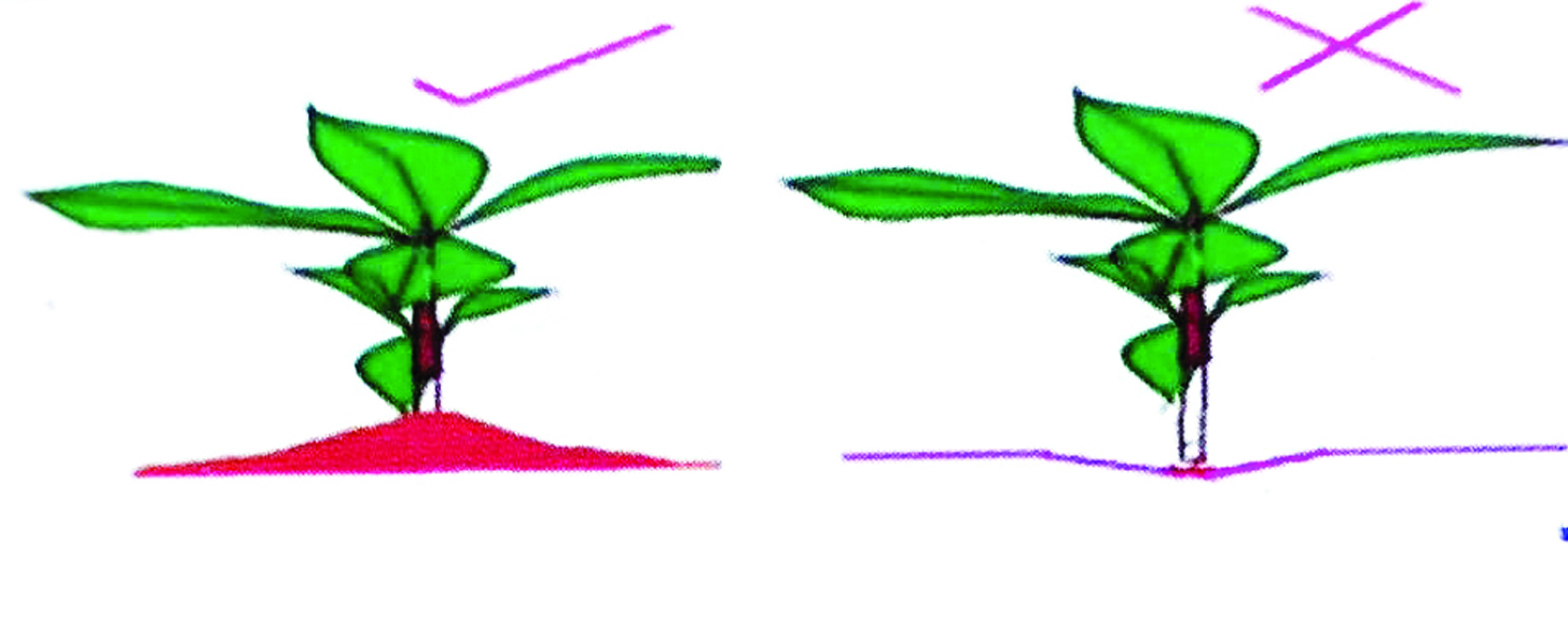 သစ်ပင်စိုက်ကြပါစို့၊ ပျိုးအိတ်မြေလုံးမကွဲစေရန် သတိနှင့်ကိုင်တွယ်ပါ။ ပျိုးအိတ်ကို လက်နှစ်ဖက်ဖြင့် အသာဆုပ်ညှစ်ရပါမည်။ သစ်ပင်စိုက်မည့်ကျင်းအနီး ပျိုးအိတ်ပလတ်စတစ်ကို လက်သည်း သို့မဟုတ် အသွားထက်ဓားသေးသေးဖြင့် ခွဲထုတ်ရပါမည်။ စိုက်ပင်ကို တည့်တည့်မတ်မတ်ထား၍ မြေလုံးကို သတိဖြင့် ကျင်းအတွင်း အသာထည့်ပြီး စိုက်ပင်ဘေးပတ်လည် လေဟာမှုမဖြစ်စေရန် ဖို့မြေကို ဖိသိပ်ပေးရပါမည်။ အပင်အခြေ ရေဝပ်မှုမရှိစေရေး မို့မောက်သည်အထိ ရောစပ်ထားသည့်မြေဆွေးပုံပေးရပါမည်။
