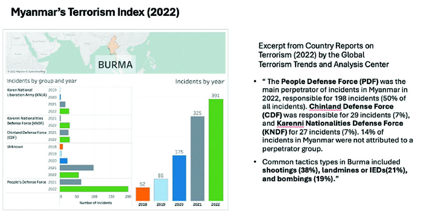 သို့သော် Global Terrorism Trend and Analysis Center မှ ၂၀၂၂ ခုနှစ်အတွက် ထုတ်ပြန်ခဲ့တဲ့ အစီရင်ခံစာမှာ မြန်မာနိုင်ငံရဲ့ အကြမ်းဖက်မှု အညွှန်းကိန်း သိသိသာသာမြင့်တက်နေပြီး အဲဒီလို ဖြစ်နေရခြင်းဟာ CDF ၊ KNDF အဖွဲ့များအပါအဝင် PDF အမည်ခံ အကြမ်းဖက်အဖွဲ့များကြောင့် ဖြစ်ကြောင်း မီးမောင်းထိုးပြခဲ့ပါတယ်။ အဲဒီအဖွဲ့ ရဲ့အစီရင်ခံစာအရ PDF အဖွဲ့တွေရဲ့ ကြွယ်ပုံရွာနဲ့ ဆုံရွာတို့ကဲ့သို့ အပြစ်မဲ့ပြည်သူတွေကို တိုက်ခိုက်မှု များကြောင့် ၂၀၂၄ ခုနှစ်အတွင်းမှာလည်း အကြမ်းဖက်မှုအညွှန်းကိန်း ဆက်လက်မြင့်တက် နေဆဲဖြစ်ကြောင်း ဖော်ပြထားပေမယ့် အနောက်အုပ်စုနိုင်ငံများက မြန်မာနိုင်ငံအပေါ် နိုင်ငံရေးအရ ဖိအားပေးလိုတဲ့အတွက် NUG ၊ PDF တို့ရဲ့ အကြမ်းဖက်လုပ်ရပ်တွေကို မသိချင်ယောင်ဆောင်ပြီး ခေါင်းစဉ်အမျိုးမျိုးနဲ့ ငွေကြေးထောက်ပံ့မှုတွေ ပြုလုပ်ခြင်း၊ အကြမ်းဖက် NUG နဲ့ပတ်သက်သူ တွေကို ခိုလှုံခွင့်ပြုထားခြင်းတွေကို လုပ်ဆောင် လျက်ရှိပါတယ်။