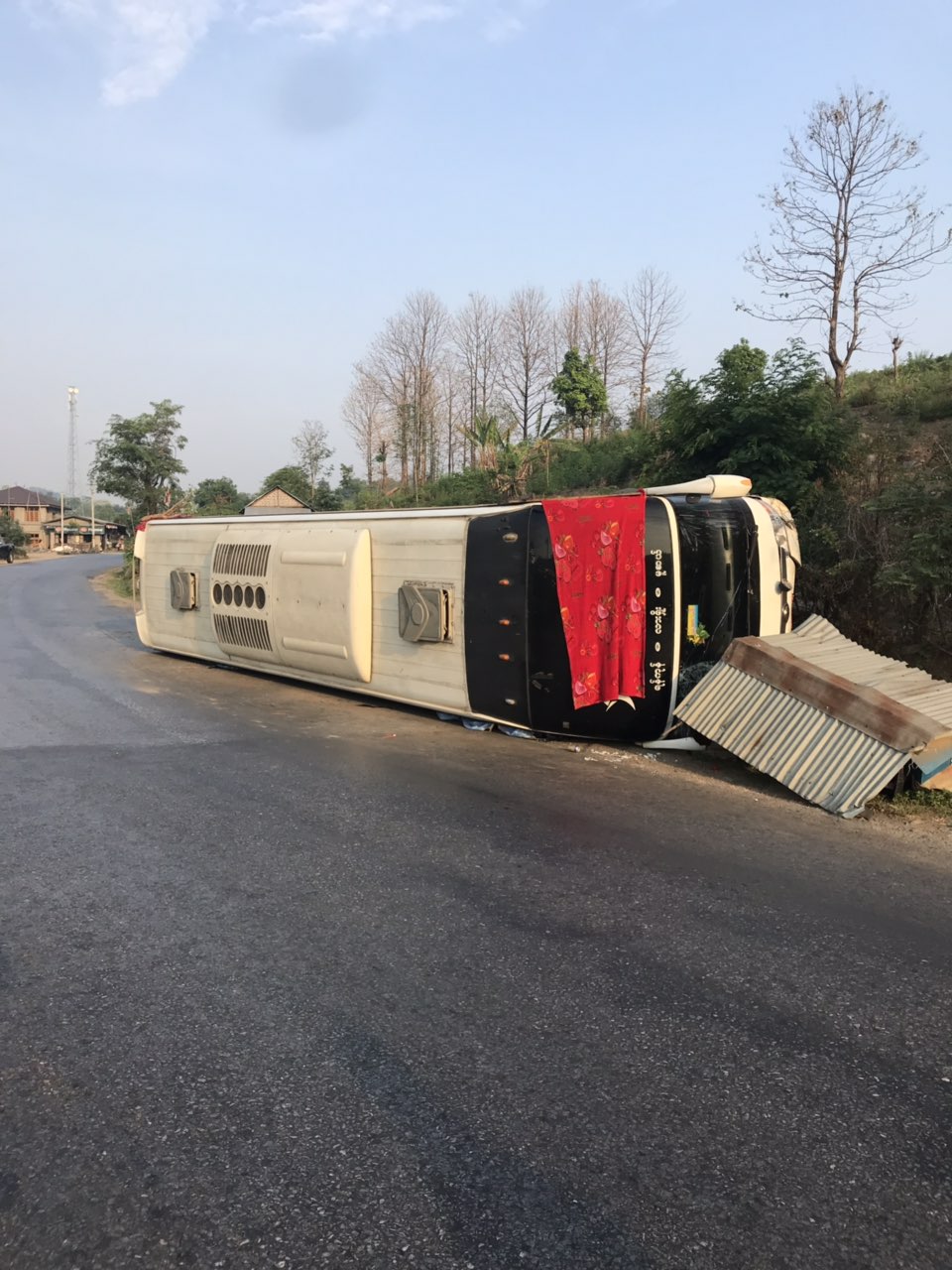 ရှမ်းပြည်နယ်(မြောက်ပိုင်း) မန္တလေး၊ သီပေါ၊ လားရှိုး၊ မူဆယ် ပြည်ထောင်စုလမ်းမကြီး သီပေါမြို့နယ် နောင်အန်းကျေးရွာအနီး မိုင်တိုင် (၁၁၈/၃)တွင် ယနေ့နံနက် ၅ နာရီခွဲက ယာဉ်မောင်း ဝင်းမင်းထိုက် မောင်းနှင်၍ ရန်ကုန်မှ မူဆယ်သို့သွားမည့် ဂျူဗီတာခရီးသည်တင်ယာဉ်အမှတ်…. သည် အရှိန်လွန်ပြီး လမ်းဘေးသို့ တိမ်းမှောက်သွားခဲ့သည်။
