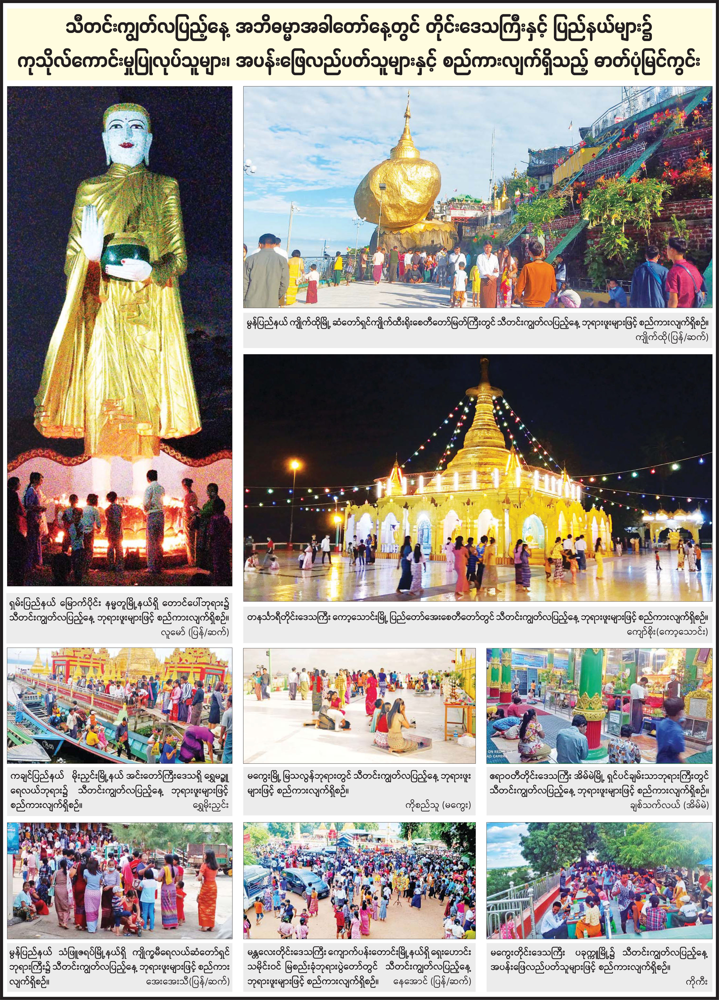 သီတင်းကျွတ်လပြည့်နေ့ အဘိဓမ္မာအခါတော်နေ့တွင် တိုင်းဒေသကြီးနှင့် ပြည်နယ်များ၌ ကုသိုလ်ကောင်းမှုပြုလုပ်သူများ၊ အပန်းဖြေလည်ပတ်သူများနှင့် စည်ကားလျက်ရှိသည့် ဓာတ်ပုံမြင်ကွင်း