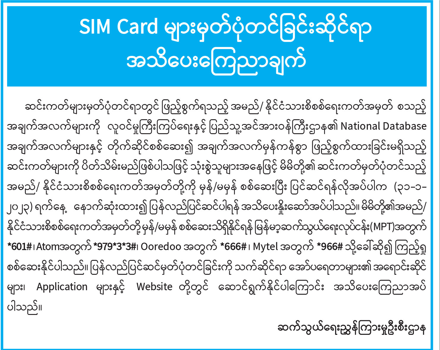 SIM Card များမှတ်ပုံတင်ခြင်းဆိုင်ရာ အသိပေးကြေညာချက်
